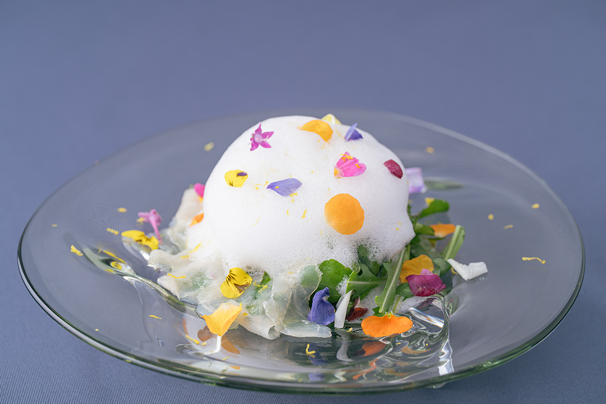 フグをカルパッチョに仕立て、山口県オリジナルの柑橘・長門ゆずきちの果汁の泡を。エストラゴンやアマランサスなどのハーブの香り、柑橘の爽やかな酸味、フグの旨みのハーモニーが見事なひと皿
