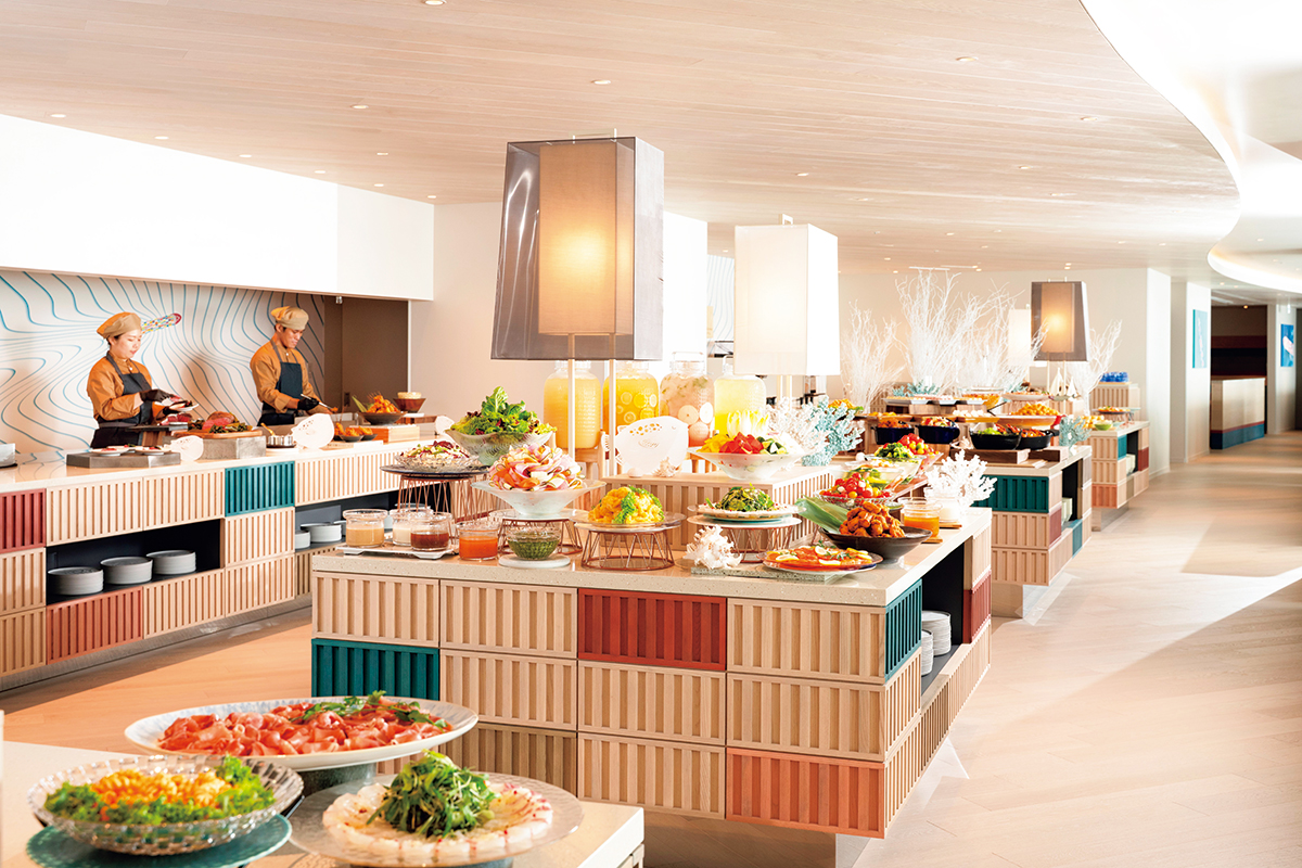 連泊するならば、種類豊富なフグ料理を満喫できる「PUKU PUKU」ディナーブッフェという選択肢も。朝食はフグ出汁をかけて味わう瓦そば、柑橘ソースのフレンチトースト、夕食はフグ料理やローストビーフの海藻包み焼きが名物。