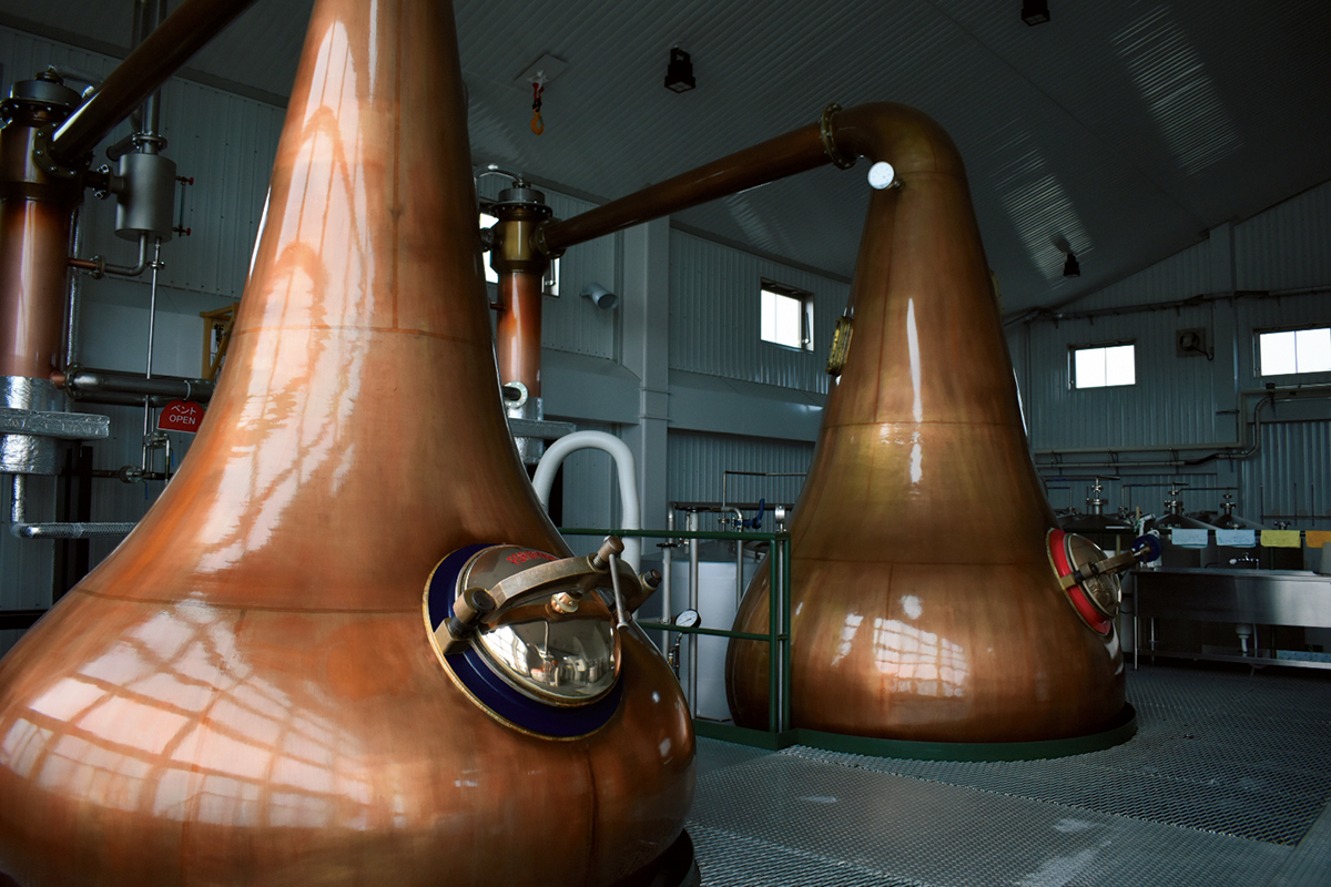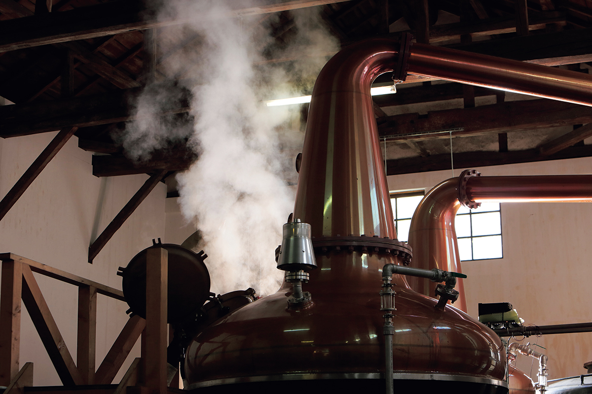 歴史ある酒蔵を改装した蒸留棟の白壁に、「三宅製作所」製のポットスチルが映える。磐梯山系の伏流水を使った小規模仕込みで、時間をかけて蒸留を行う