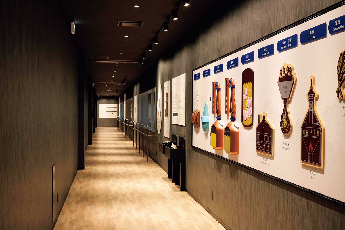ウイスキー造りの設備と製造工程を、わかりやすい展示パネルとともにガイド。ウイスキーのほか同社の清酒やリキュールの有料試飲もできる