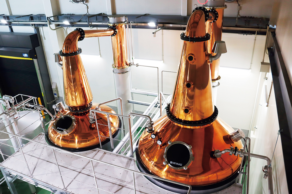 モルトウイスキーやジンの蒸留に加え、国内であまり見られないグレーンウイスキーの蒸留も見学可能。焼酎造りの技術を生かした特注の蒸留器を使用