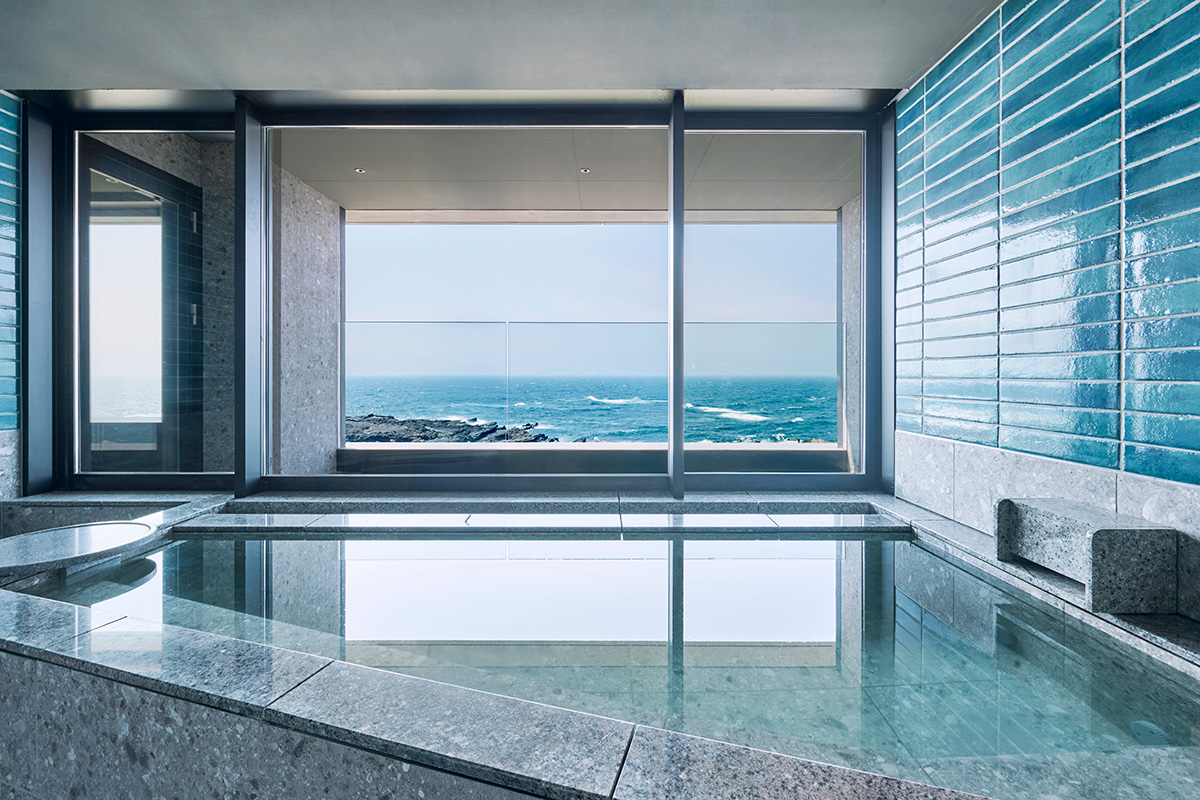 すべての客室には天然温泉が備えられ、眼前に広がる相模湾を眺めながら湯に身を委ねらる。海と一体になるような感覚になれる湯浴み体験は、ここでしか味わえない贅沢のひとつだ。