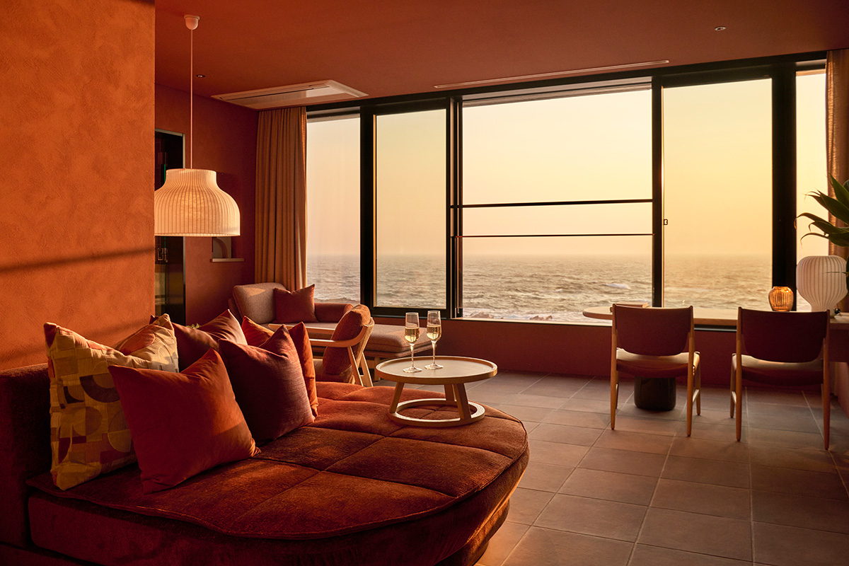 城ヶ島の岬に位置する全室オーシャンビューの客室からは、空と海が溶け合う水平線を一望できる。夕陽がゆっくりと水平線へ沈み、刻々と移ろう海の表情を味わうひとときは格別。全34室は7タイプのレイアウトで構成され、それぞれがゆったりとしたプライベート空間を演出している。