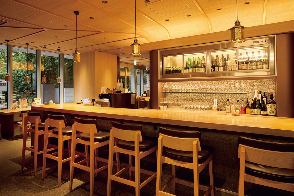 日本酒発祥の地と伝わる奈良県三輪の「大神神社」の杉玉が迎える空間は、窓の外の「福徳神社」と一体感を覚える天井の曲線、鍛金師・伊藤祐嗣氏の灯具など、伝統と洗練が漂う。飲食スペースも併設し、飲み比べセットや各種おつまみ、ランチタイムは名物の博多うどんなども楽しめる