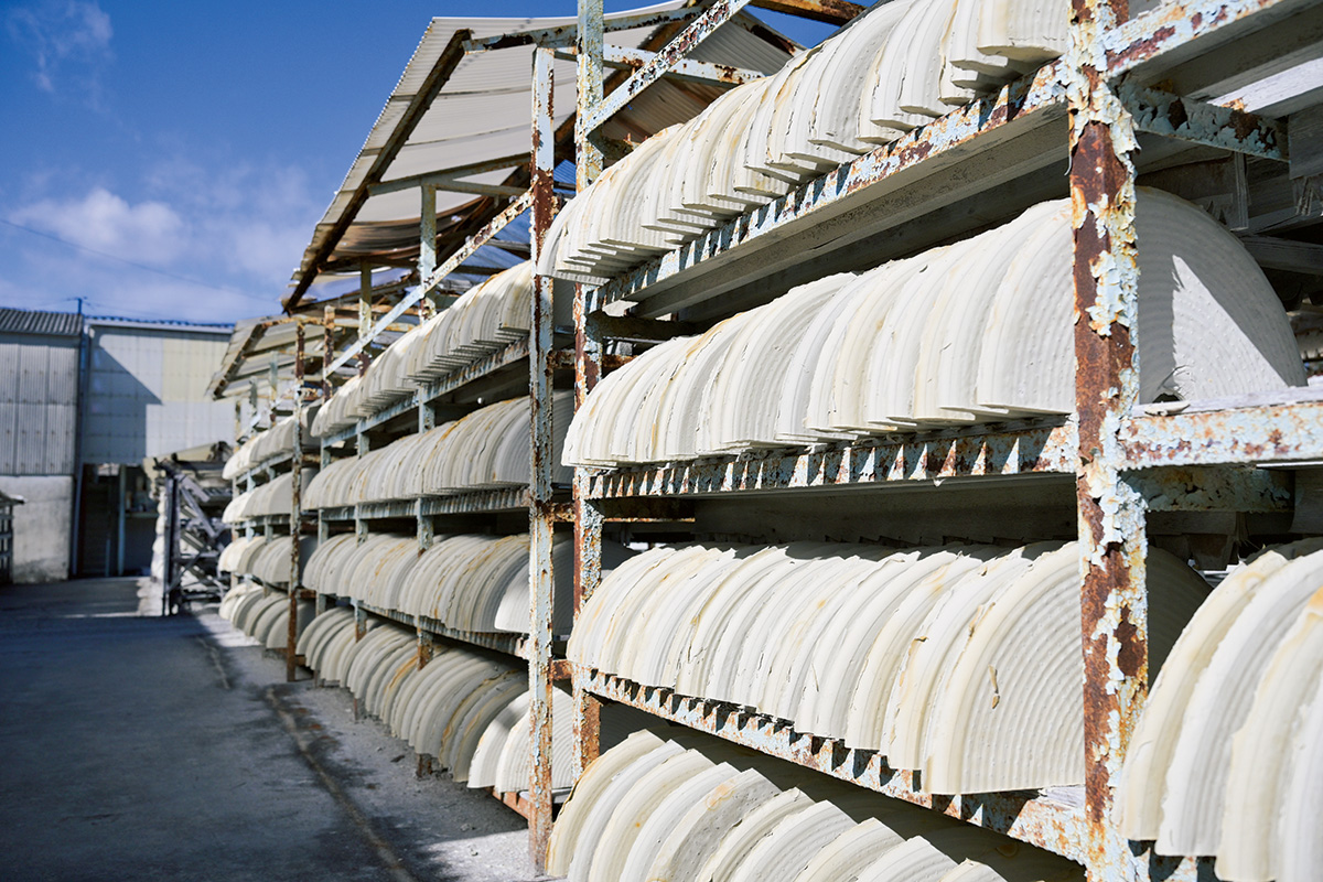 鉱山から採れた原土は、多くがさまざまな工程を経て窯業用土になる。「加仙鉱山」では原土を砕いて水に溶かし、珪砂けいしゃ雲母きらなどの不純物を丁寧に除き精製、脱水の上天日で乾かし「水簸すいひ蛙目粘土」をつくる。