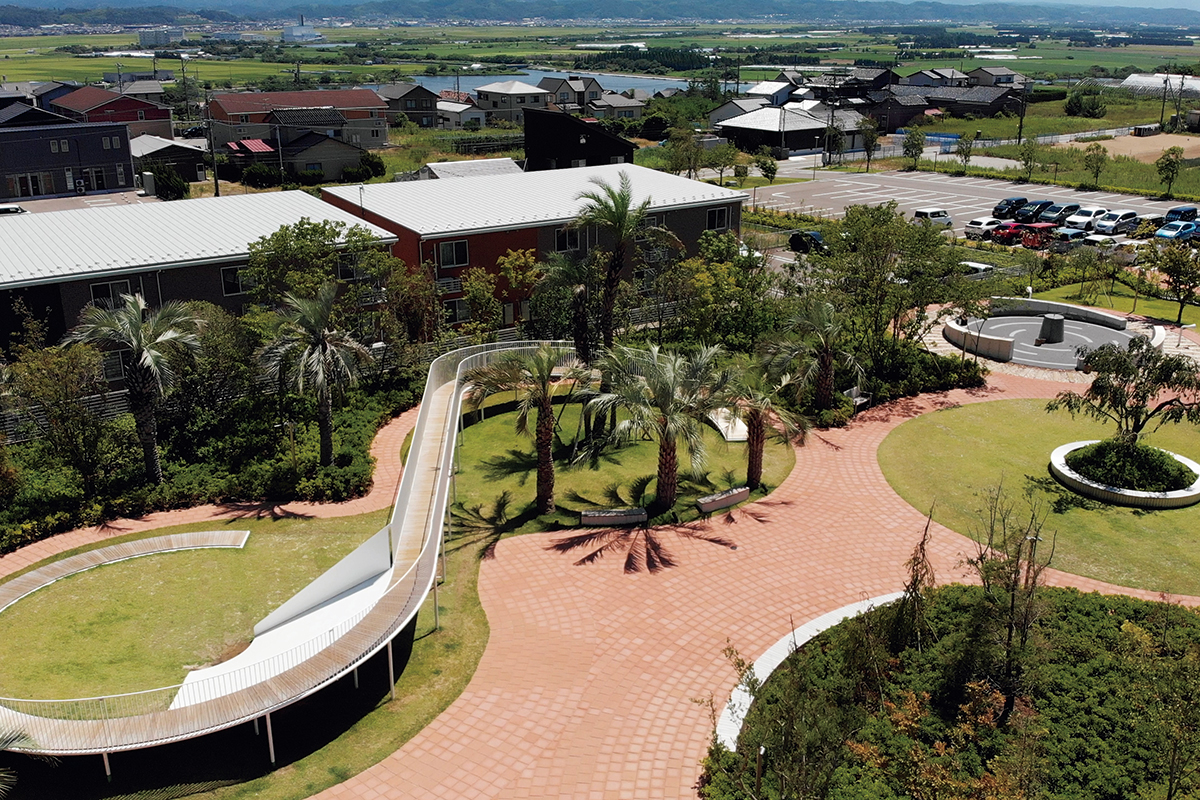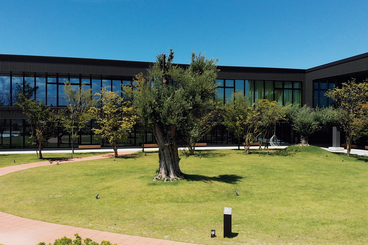 プラントハンターの西畠清順氏が監修する、多彩な表情をもつガーデン。79本の桜の木やオリジナルの遊具が迎えてくれる「ウェルカムガーデン」、樹齢約1000年のオリーブが鎮座する「オリーブガーデン」がある。晴れた日には、白山や立山連峰を眺めながらコーヒーを楽しめるスペースも。