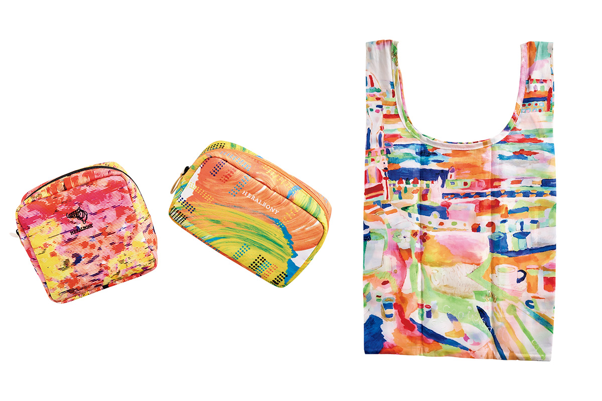 「日本航空」とのコラボレーションによる、国際線ファーストクラス・ビジネスクラスの機内アメニティポーチ。水上詩楽氏や藤木敦仁氏など、契約作家の作品を採用