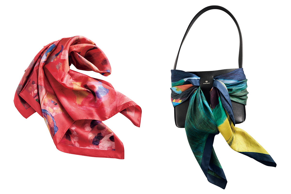 表も裏も美しい、定番商品のアートスカーフ。シルク素材100% で、88×88㎝の大判サイズ。三谷由芙氏の作品をはじめ、30種類近くの作品のパターンが揃う。2万4200円