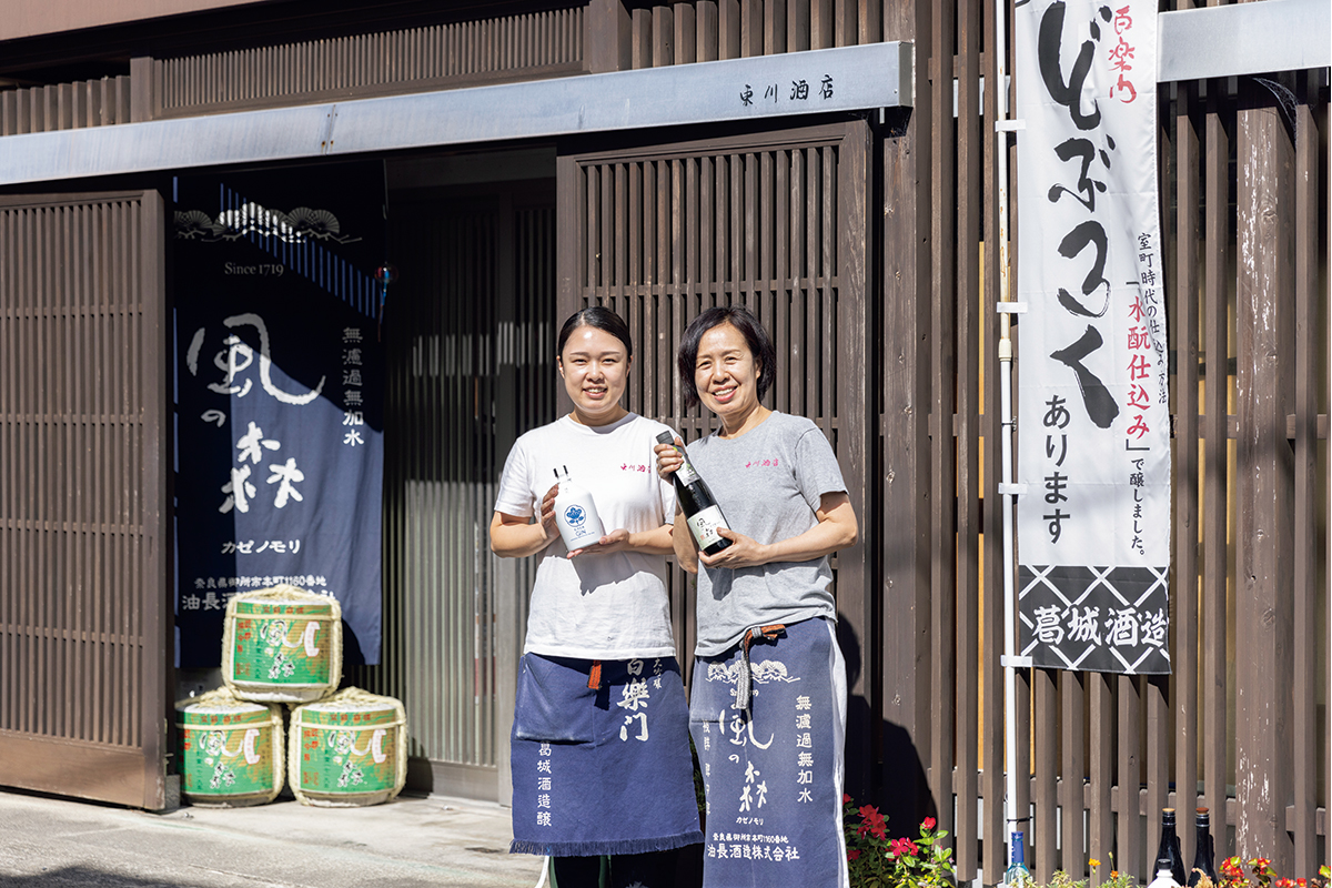 御所のまちで5代続く老舗酒販店。市内3つの蔵元の酒を豊富に揃える特約店として、全国の地酒ファンからも支持されている。店主の東川宣子さんと娘の早希子さんが店を切り盛りする