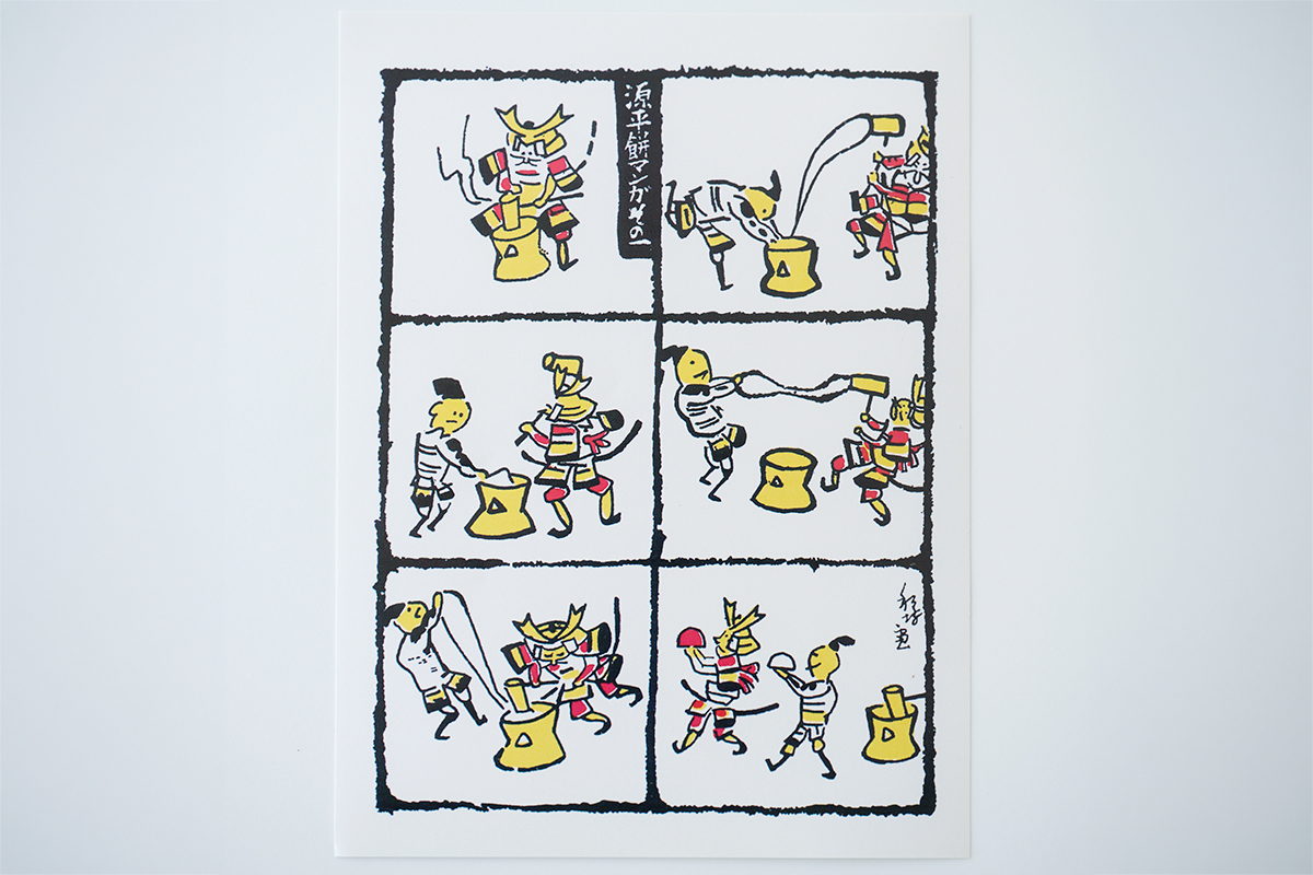 10個入り432円。邦坊作の「源平餅マンガ その一」と題された4コマ漫画の栞