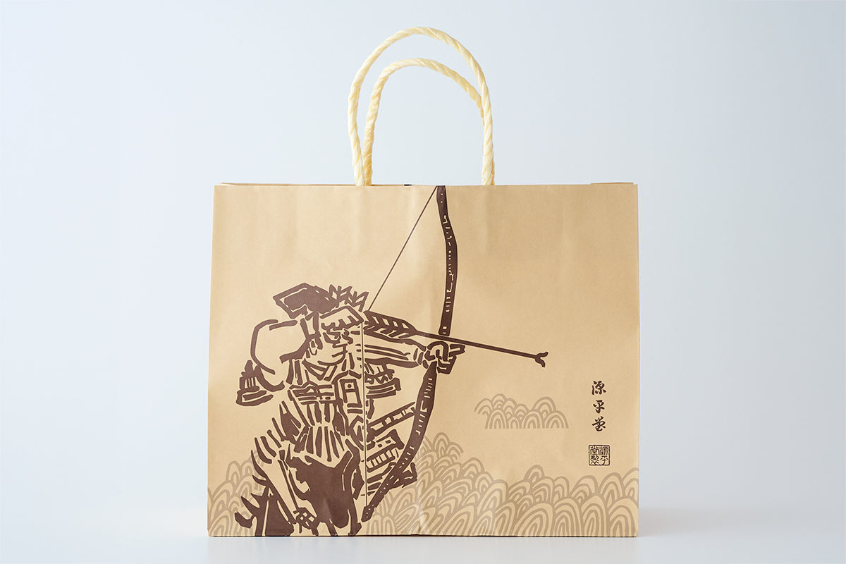 民藝の思想を取り入れた作風で地元産業のブレーンとなった香川出身の才人・和田邦坊は、多くの讃岐物産をデザインしましたが、実は源平餅の包装紙と箱絵もそのひとつ。邦坊が箱絵の画題に選んだのは、屋島の戦いの逸話の中でも人気の高い名場面「那須与一の扇の的」。失敗すれば自害と心に決めた与一の決意の姿を描いています。