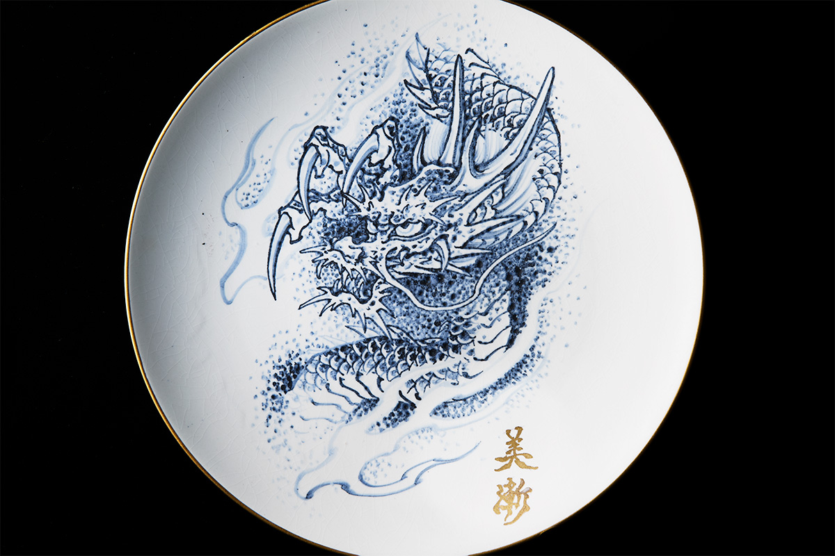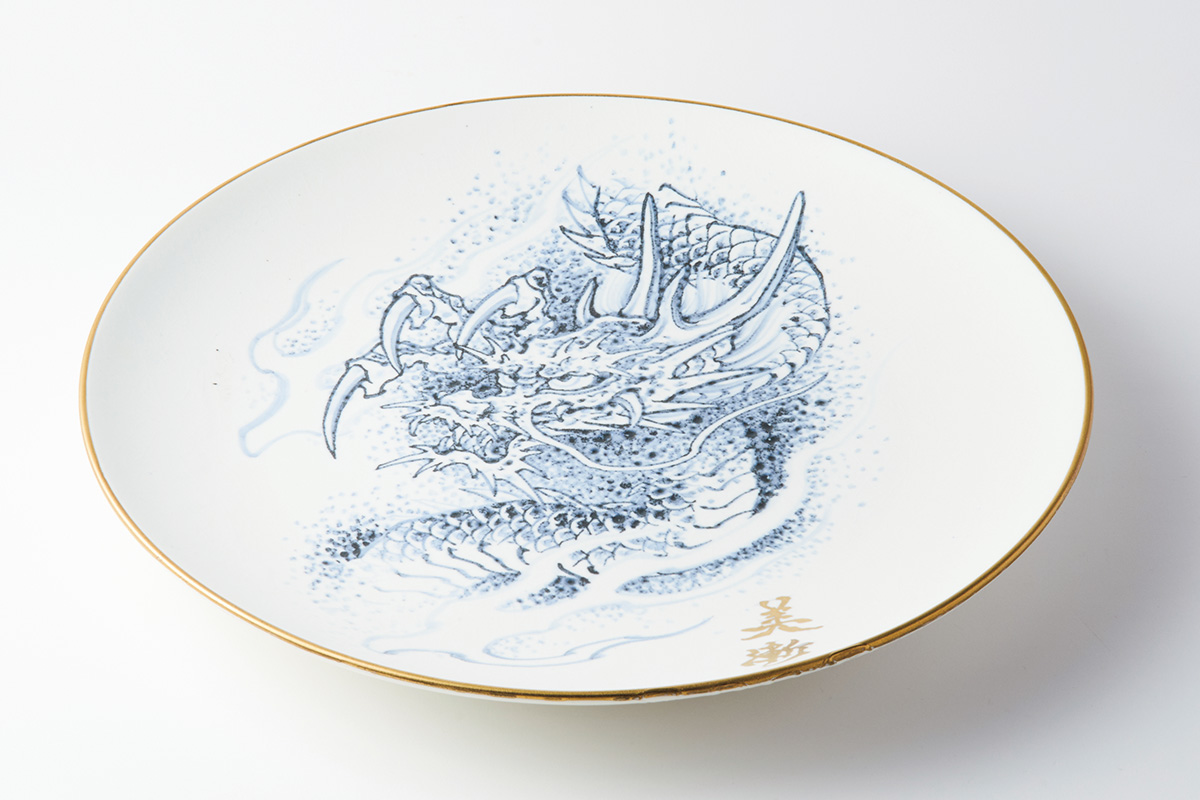 美漸さんとのコラボレーション作品。白磁の大皿に浮かぶ龍の姿が幻想的。いまにも動き出しそうなほどリアルな表情を醸している。金の縁取りが煌めきを添える。