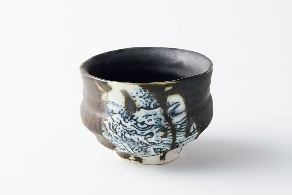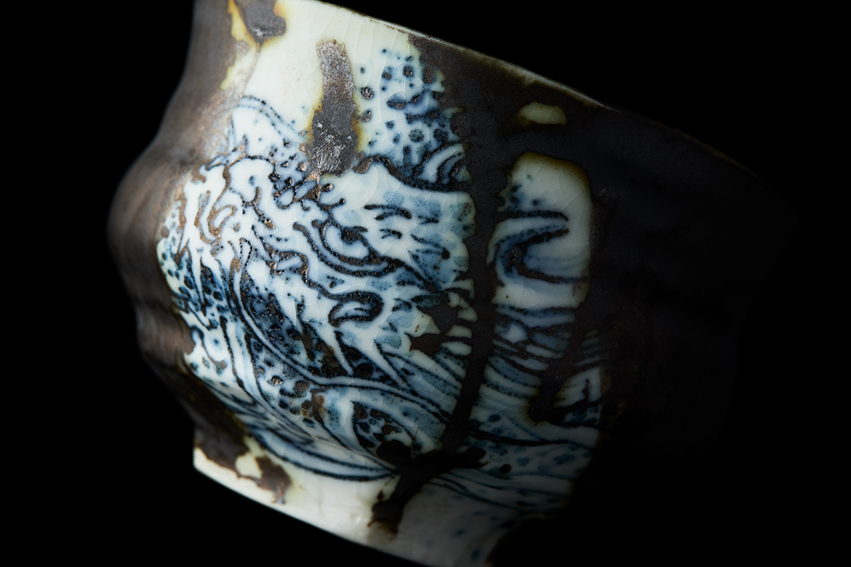 青木さんが成形した黒織部の「窓」に、美漸さんが呉須で龍を描いてく。大胆で伸びやかなうつわに、緻密で力強い龍が共存。これぞコラボレーション作品の醍醐味