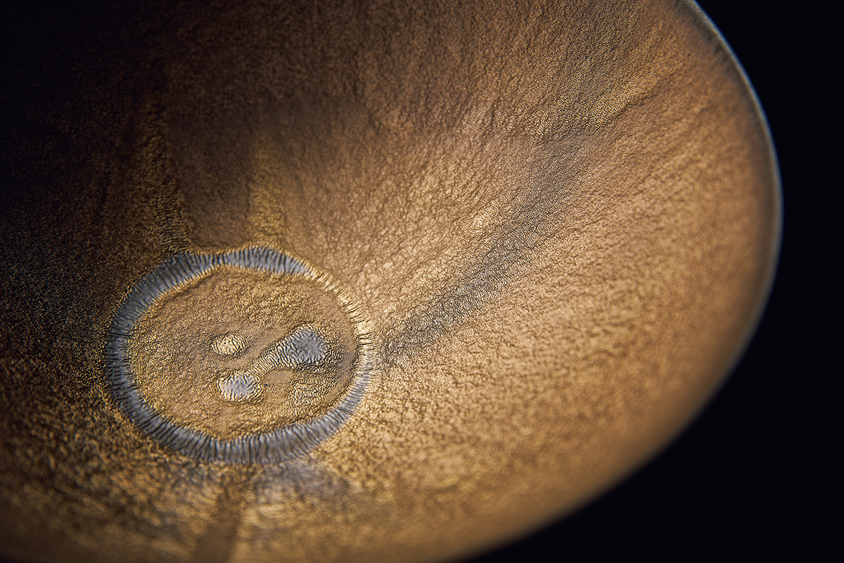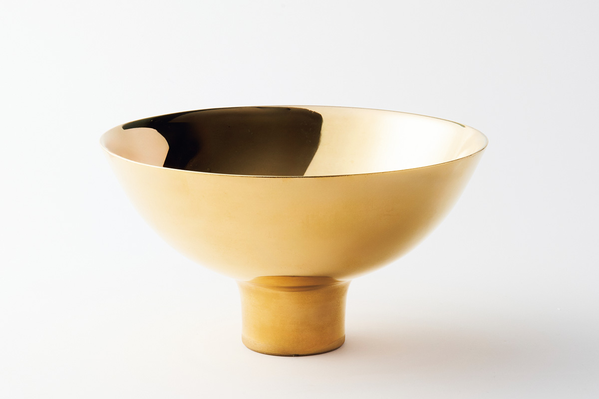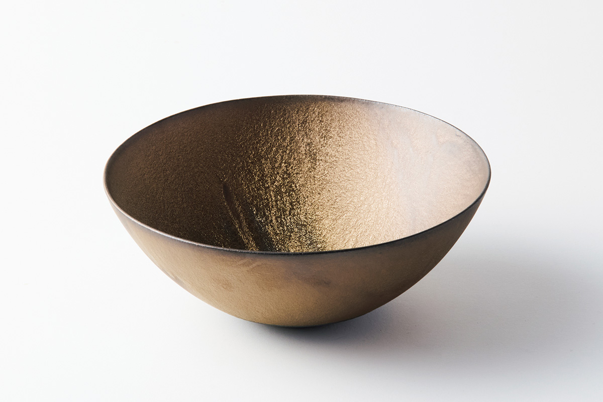 20数年にわたる試作を経て誕生した作品。18金を使わずに鈍い黄金色を再現。電子レンジや食洗機の使用も可能で日常使いできる。サラダボウルなどに。