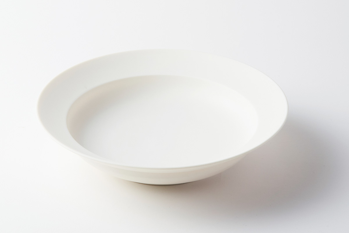 白磁に釉薬を混ぜ込んで焼き上げた、赤ちゃんのようなすべすべした手触りの作品。シミや黄ばみは塩素系漂白剤でスッキリ落とせる。パスタ皿として重宝する。
