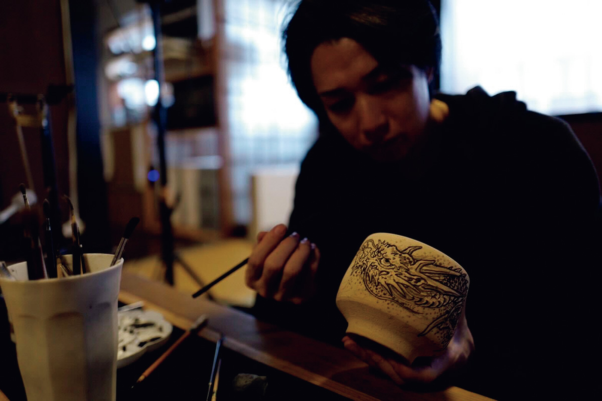 彫りの場合、身体の曲線や動きに合わせてデザインを配置。最終的には身体のシルエット自体をも美しく見えるように彫り上げていく。うつわも同様で、青木さんが生み出すフォルムをいかに生かすか。そのためにたどり着いたのが“余白”だった。時に大胆に、時に繊細に。龍の存在感を前面に出すのではなく、強弱や濃淡をつけて気配を醸し出す。すると独創的なうつわに自然と馴染み、一体感が生まれる。また、絵付けには呉須ごすと呼ばれる顔料を使用。扱いは難しいが、白い磁肌に映る上品な藍色は格別だ。