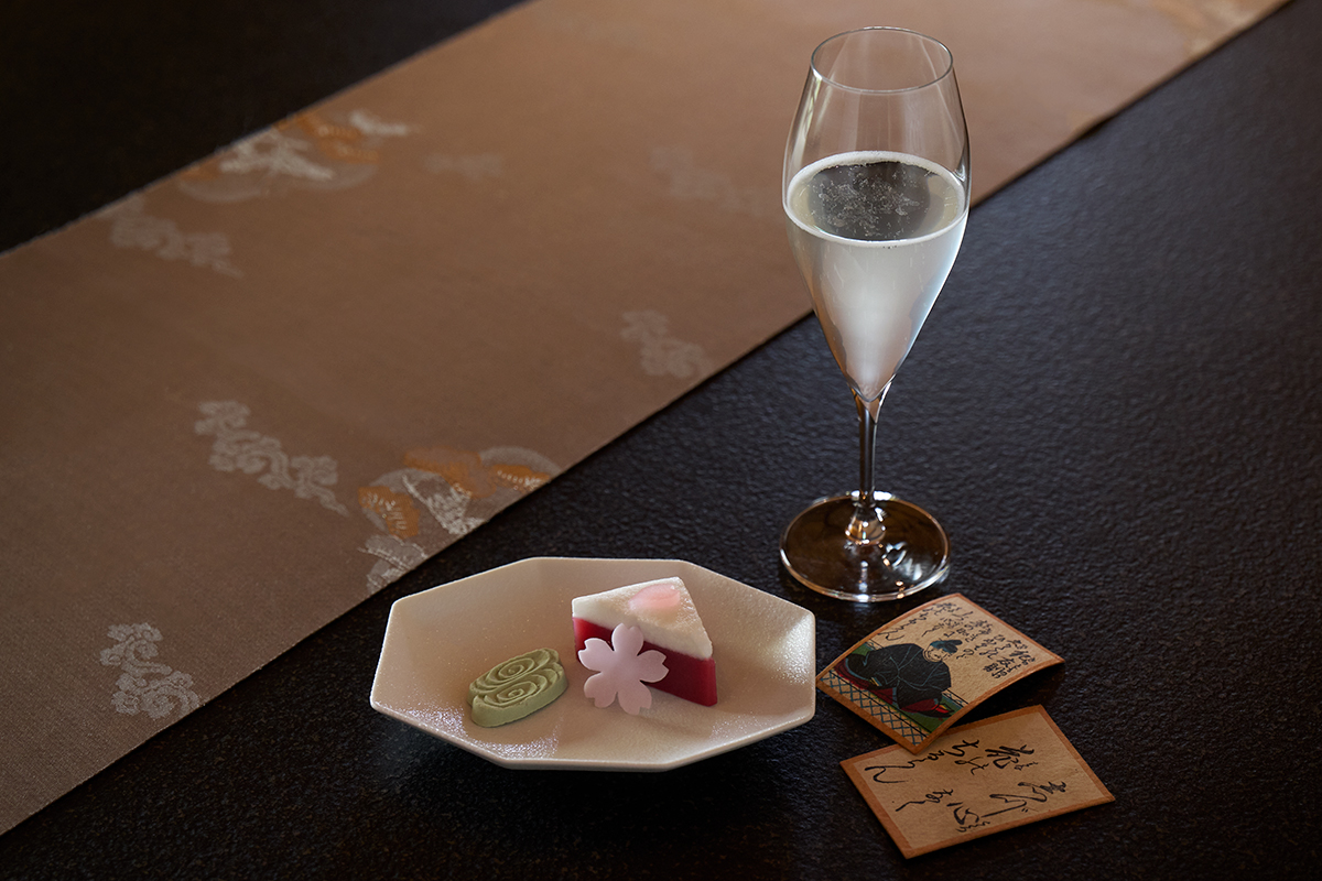 ウェルカムのひとときは、「亀屋良長」による星のやオリジナルの和菓子で寛げる。百人一首から着想を得たもので、桜の季節は紀友則の歌に寄せて、散りゆく桜を表現した羊羹を用意。スパークリング日本酒やノンアルドリンクとともに