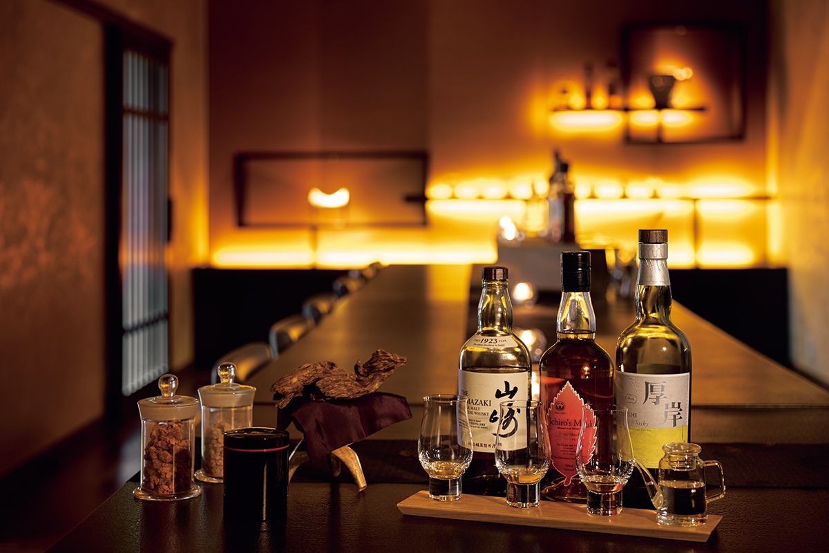 カウンターには個性もさまざまなジャパニーズウイスキーが並ぶ。そばには伽羅や沈香といった香木、そして龍涎香(りゅうぜんこう)などの稀少な香原料がある。悠久の時を重ねて生まれる香りと、香りの酒とも称されるウイスキーの多層的なアロマ。ふたつを重ね合わせると、感覚は思いがけない方向へと導かれ、ウイスキーの味わいまで変化する。まずは「ウイスキー3種聞きくらべ」から
