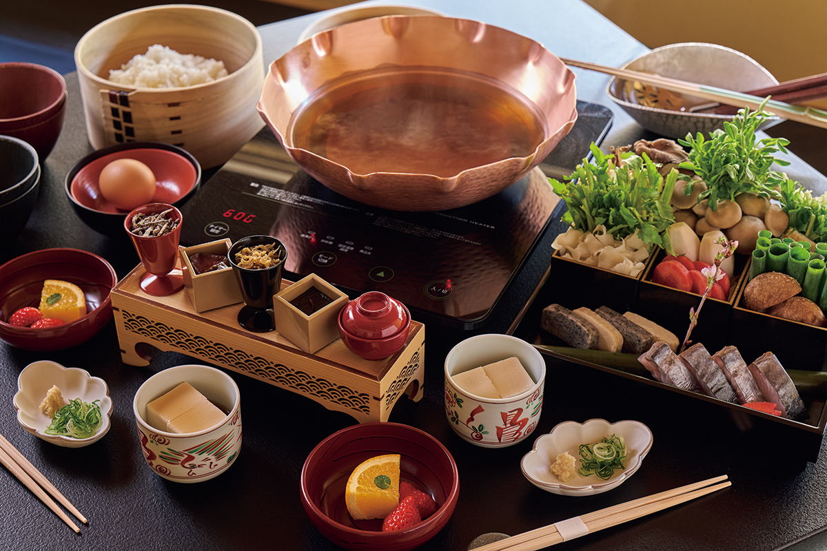 朝食は部屋でゆっくり朝鍋を。旬の野菜とキノコをたっぷり、出汁とともにいただく。サワラやハモなど季節の魚も加わり、食材の旨みが溶け出した出汁でつくる締めの雑炊はたまらない。ほかに5種のご飯の供、豆腐、水菓子など盛りだくさん