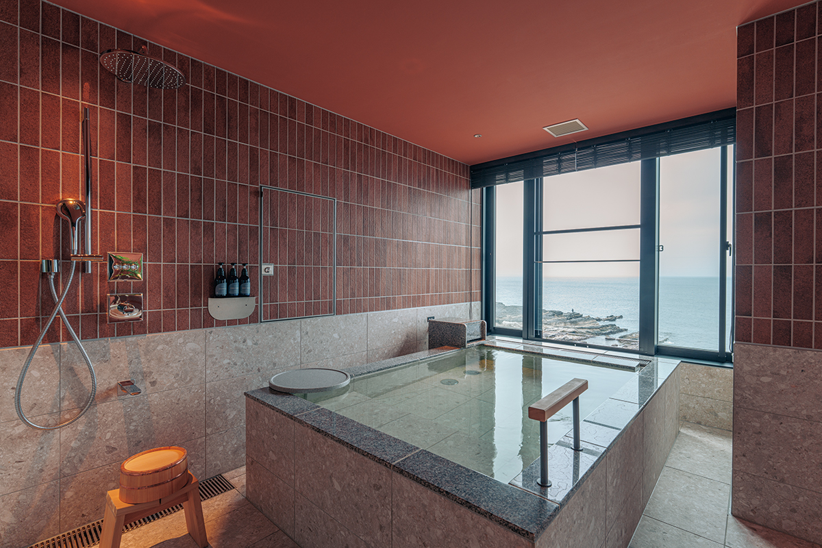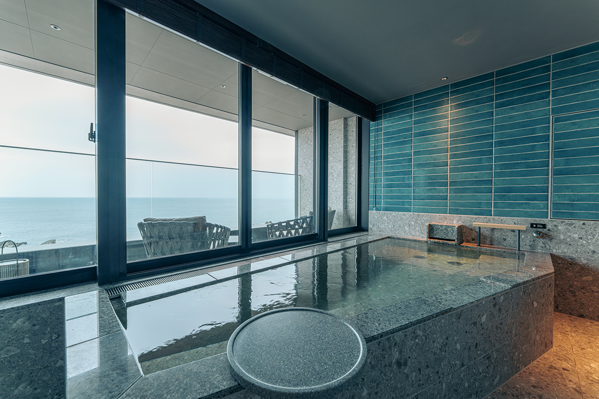 海を目の前にして建つ「ふふ 城ヶ島 海風のしらべ」では、すべての客室がオーシャンビューである。視界に遮るもののない部屋の窓からは水平線が見渡せ、海岸沿いに続く奇岩層に目が止まる。客室からバルコニーに出れば、間近に迫る海の波音や潮の香りに包まれ、海を全身で感じられる。