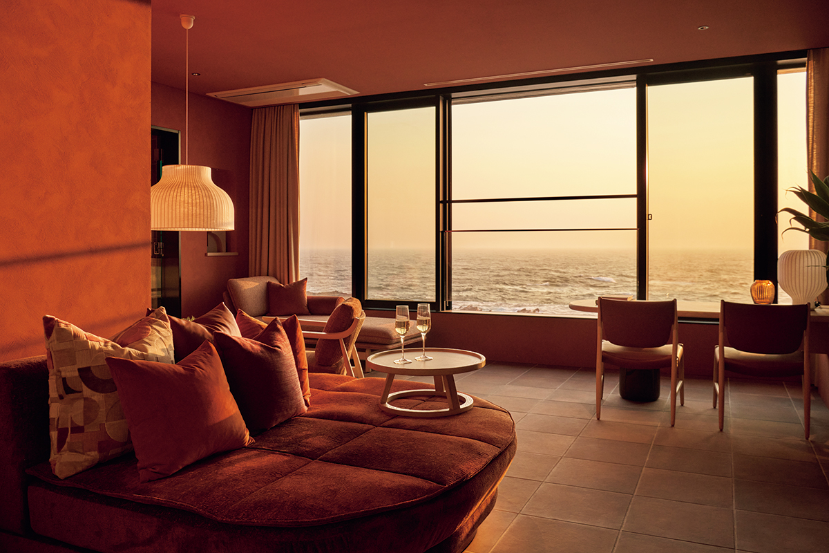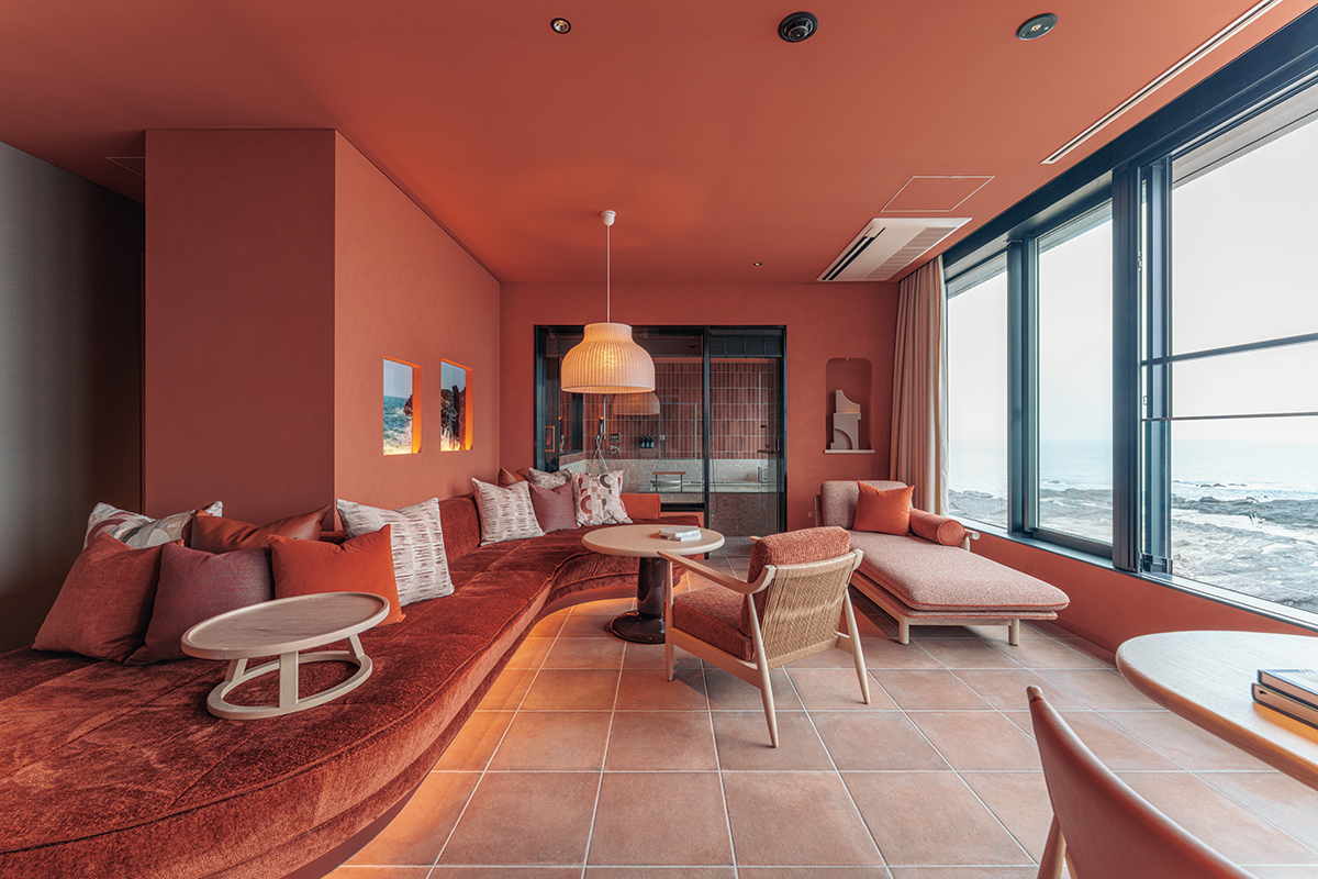温かい印象のテラコッタ色がメインに使われた「ふふ オーシャンスイート」(約105㎡)。大きな窓には海が映り込み、長いソファや窓辺のデイベッドで何もしないでまったりと