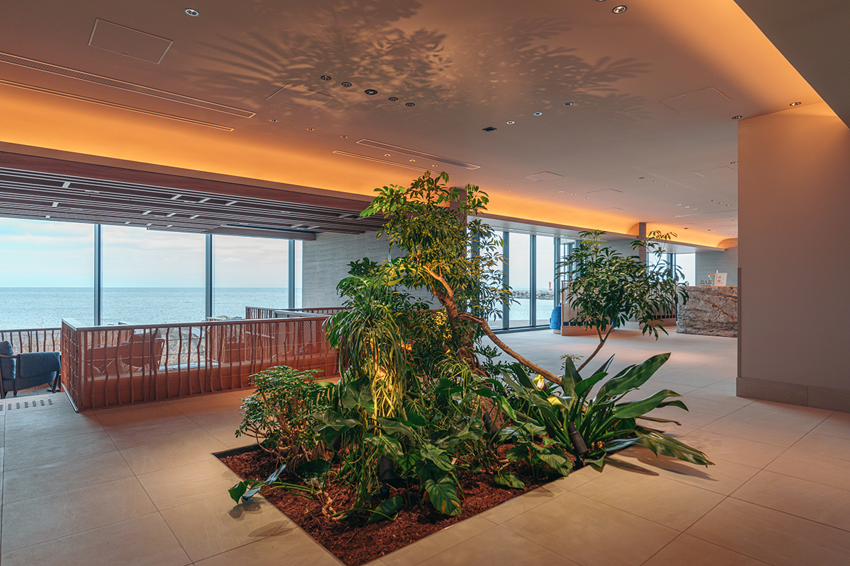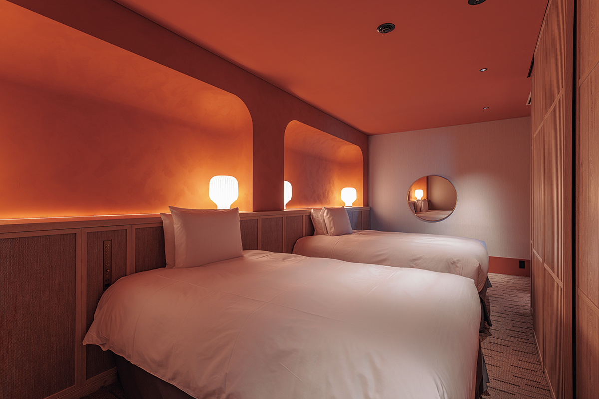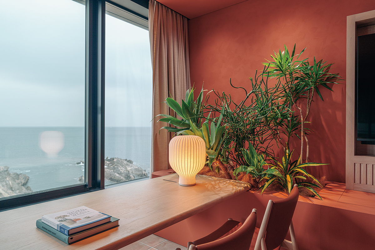 室内の色調は部屋によって異なり、海や空の色、景色といった、この土地の要素を映し込む。温かな印象のベージュや、落ち着きのあるグレージュ、サンドなど素材の色にも細やかな配慮が行き届いている。こうした室内や館内の色使いは「海や空、岩場や岩礁など外の風景を受け止め引き立てるための背景としての色」だという。各客室内の色のアクセントにはテラコッタ、イエロー、ブルー、グリーンといった優しげなアースカラーがライトタッチで配されている。