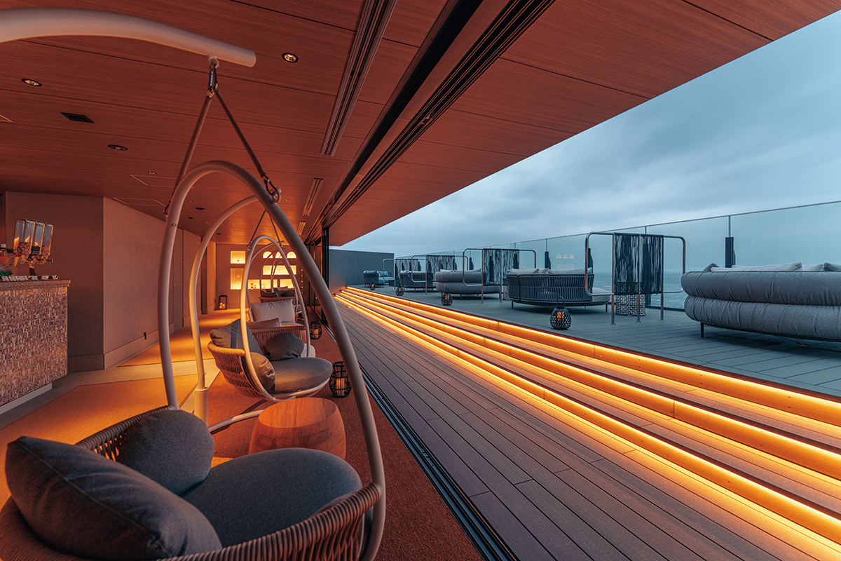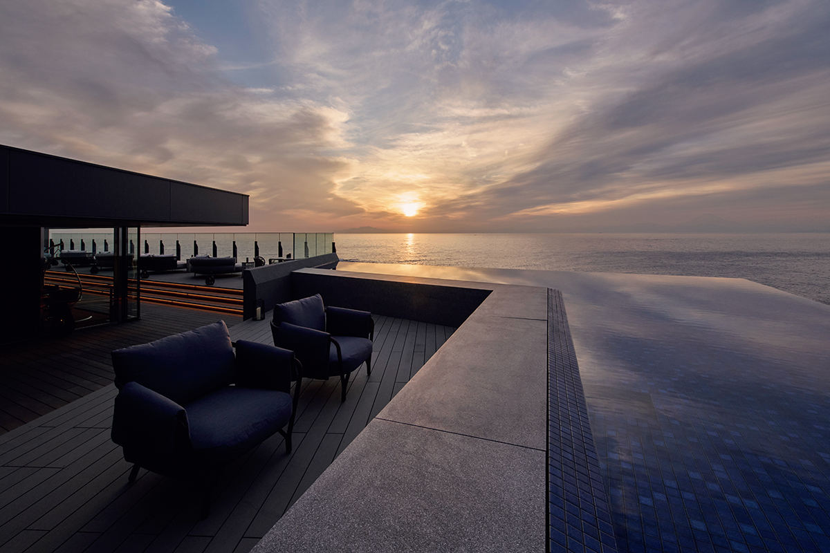 ルーフトップラウンジにはダークブルーのタイルでインフィニティ水盤がつくられ、映り込む光や風の移ろい、雲の動きが水面に流れていくような様子が愉しめる。このルーフトップラウンジ「宵星」にはカウンターやソファの席もある。よく晴れた凪の夜、ソファに座り、海面に現れる“月の道”を眺めるのも旅情となろう。