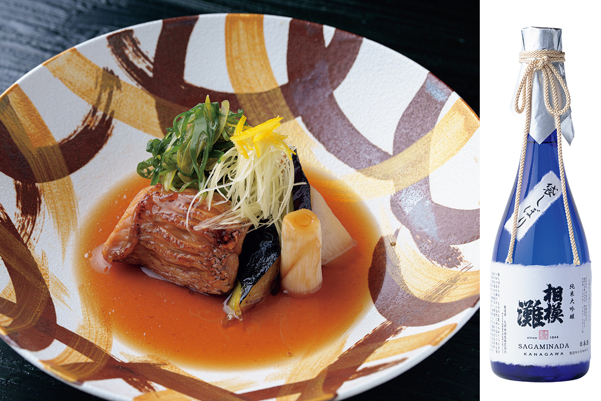 ノドグロ(正式名称アカムツ)の蒸し煮と揚げナス、ウド、絹ごし豆腐。味つけは濃口醤油、酒、砂糖で。九条ねぎ、針生姜柚子、昆布を添えて。懐石料理の中でも酒を進めるための強肴だけあって、地元・神奈川の日本酒が進む。