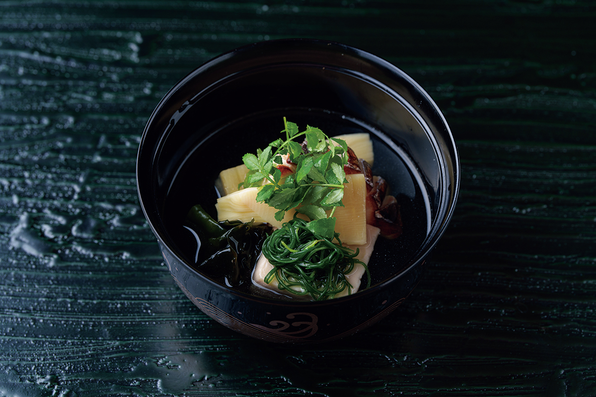 上品な味わいのサワラと若竹、ゴマ豆腐、おかひじき、新ワカメ、木の芽を添えた椀物。削り節と昆布のさっぱりとした出汁で楽しむ早春の味覚。
