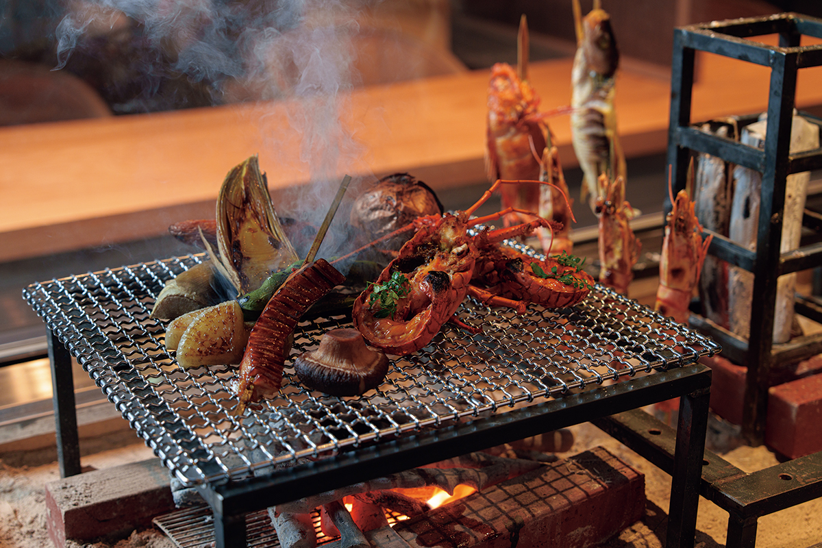 「日本料理 汐結」のメインはライブキッチンの炉端による炭火焼きである。旬の魚介類が炉端で香ばしく焼かれ、旨みが凝縮されるのだ。