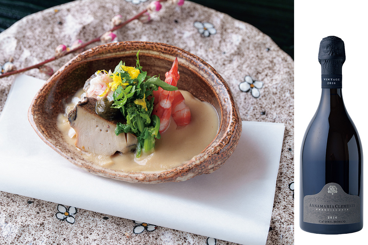 蒸し鮑と車海老のミルク味噌仕立て。軟らかく蒸したアワビに肝と味噌、牛乳のソース。菜の花、木の芽などみずみずしい色合いと香りの春の食材をあしらい、アワビの貝殻を模した有田焼で。“如月”の献立として春の訪れを演出。爽やかなフランチャコルタと。