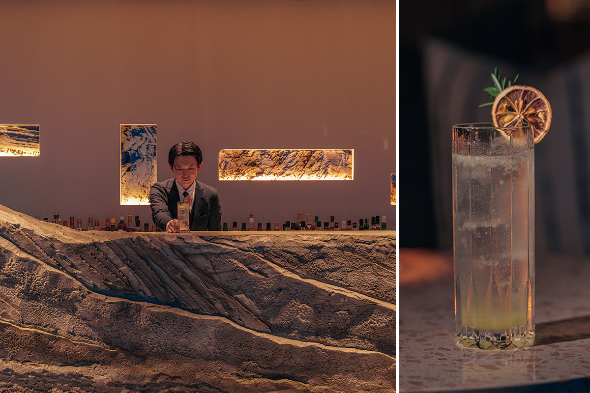 1階にあるバーラウンジでは地元のフルーツを使ったカクテルなどをさまざま提供。写真のカクテルは「KAIKO」(2000円)。三浦レモン、ジン、シトラスビター、ソーダで海風を感じる爽やかな一杯。左写真のバーカウンターは海岸の岩をイメージ。