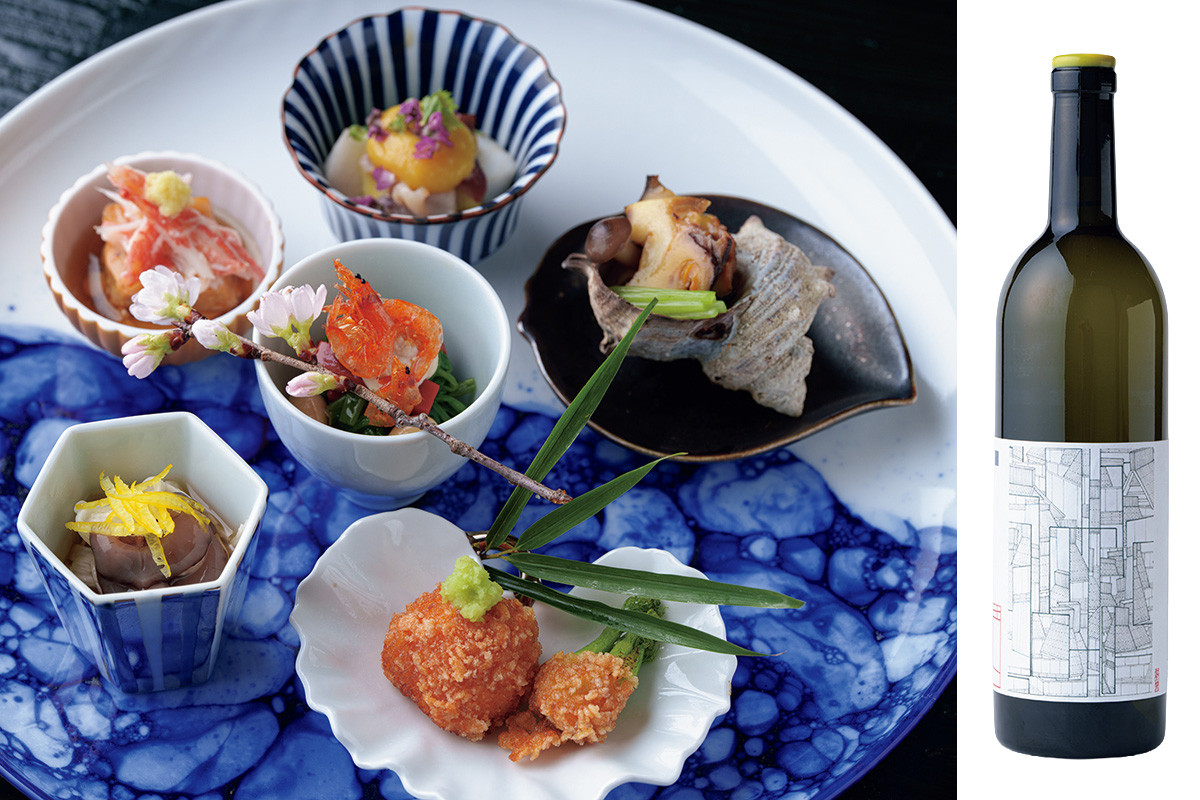 ホッキ貝、ウドに九条ねぎのぬた和え、姫サザエの酒蒸し、海老真丈のおかき揚げ、長芋昆布締めと土佐酢を使ったナマコ酢、あん肝と下仁田ネギの軟らかスープ煮にズワイガニのあんかけ。中央には煮豆、セリ、赤こんにゃくの白和え、桜海老。山梨産白ワインとともに。