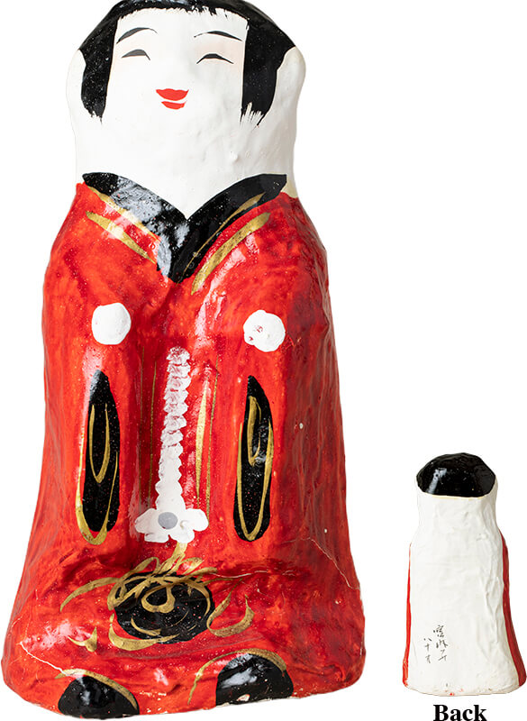 香川県・高松市の郷土玩具・張り子人形。100歳を超えても現役だった宮内フサさんの作。晩年は人形の背面に製作時の年齢を書いて長寿のおすそ分けとしていた。「柔らかで温かい表情は宮内さんにしか出せません」。