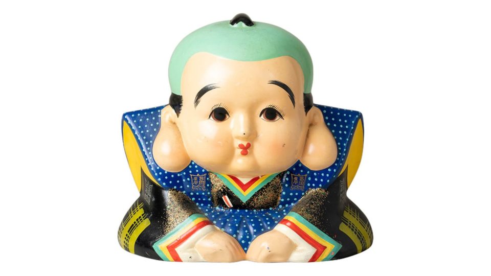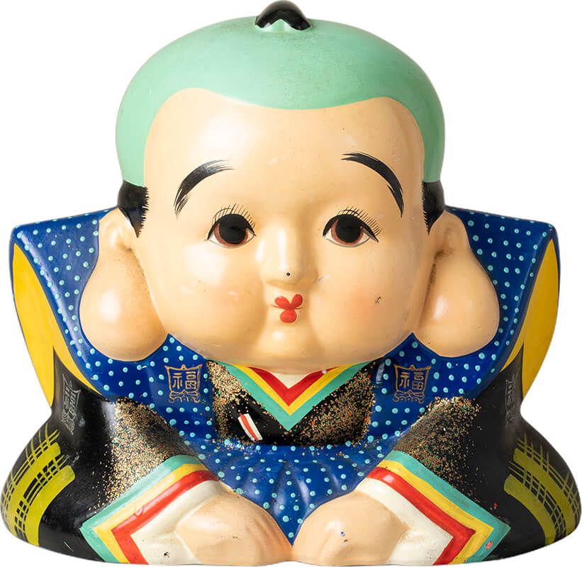 博多人形の一種で、愛嬌たっぷりの顔がポイント。郷古さんは大きさ、迫力、耳の具合などの細部に至るまでじっくりと観察し、好みの福助を見つけ出す。「着物のドット具合も絶妙。商売する方の手元へぜひ!」