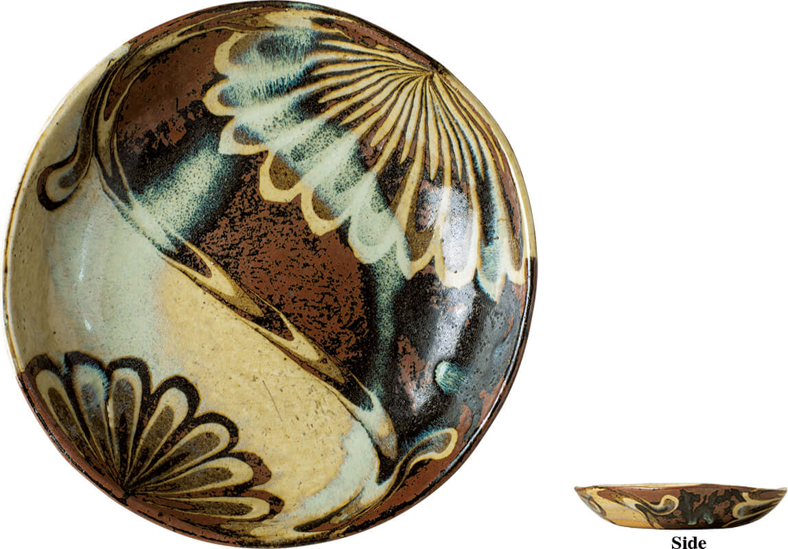 上田恒次作の深皿。河井寬次郎の作品によく見られる「練り上げ」の技法だが、弟子として寬次郎からその技法を継いだのが上田。両サイドに花咲く、菊紋が印象的なうつわは、毎日の食卓を華やかにしてくれそう。