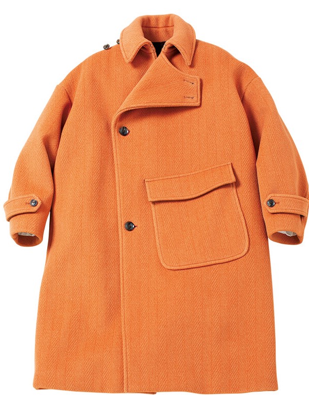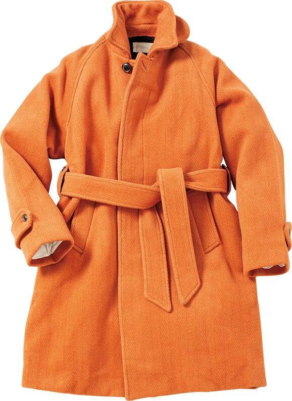 落ち着いたオレンジの色合いが美しいバルマカーンコート。肉厚で張り感がありながらも繊細な本パイルメルトンの生地は、着用時の重さを感じさせない仕上がり。比翼のフロントを閉じてもマント風に着てもサマになる。