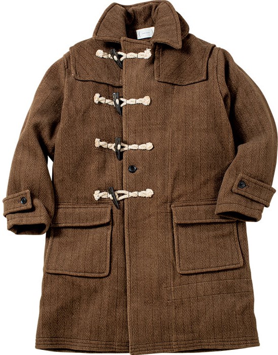 新しいデザインで登場したダッフルコートは、シルエットにゆとりをもたせた大人のスタイル。生地は、こだわりの二重織のヘリンボーンを使用した。リアルホーンの4つのトグルが上品でトラディショナルな印象に。