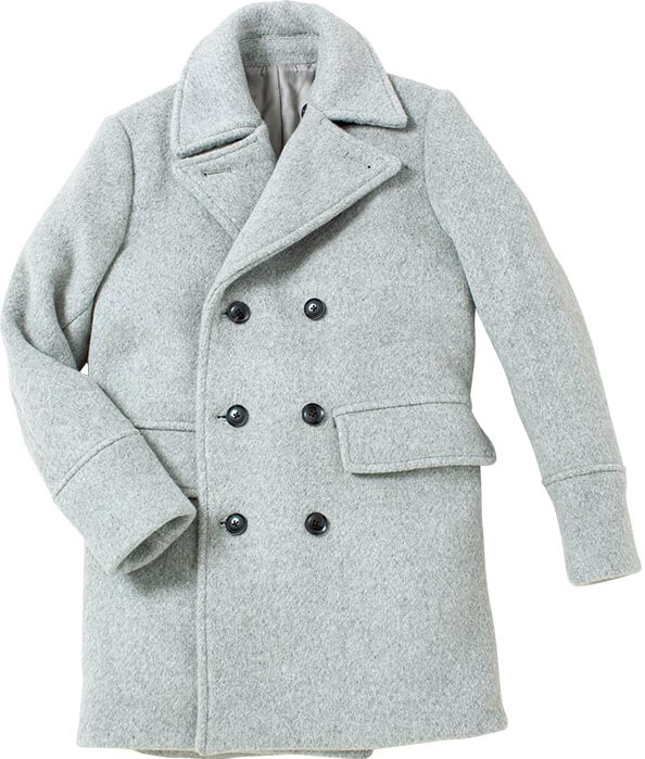 5番単糸のカシミアを二重織し、アザミ起毛を施したピーコート。安定感のある本格派の肉厚生地なので、一生ものの冬アウターとして重宝すること間違いなし。ほかにはない、ライトグレーのカラートーンも魅力だ。