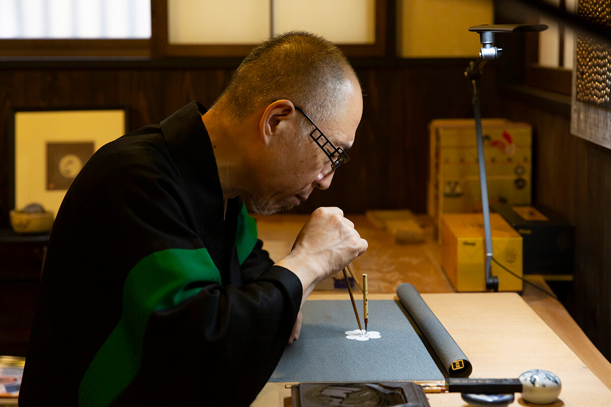 承龍 もともと紋章上繪師は祖父がはじめ、私で3代目なのですが、23歳で独立した後、昭和40年代にシルクスクリーンの技術が普及し、手描きの仕事の需要が激減しました。私は手描きにこだわりながら、別で立ち上げた着物の総合加工会社の仕事をやっていたのですが、50歳になる頃に「家紋を新しいかたちで世に残すために作品をつくりたい」と思ったんです。