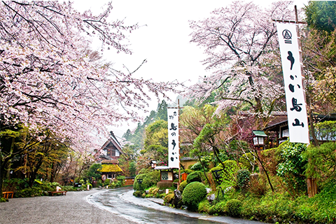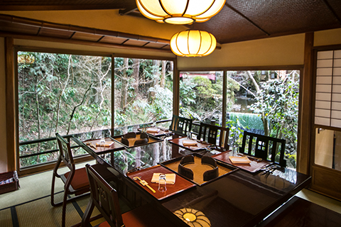 「うかい鳥山」は、千本桜をはじめミツバツツジやスミレなど春の彩りに溢れる奥高尾にあり、約6000坪の敷地に風情のある日本庭園が広がっています。敷地(庭)に配された合掌造りや数寄屋造りの約40の部屋でゆったりといただけるのは、厳選素材をじっくりと香ばしく焼き上げる「いろり炭火焼」を中心とした料理の数々。