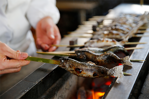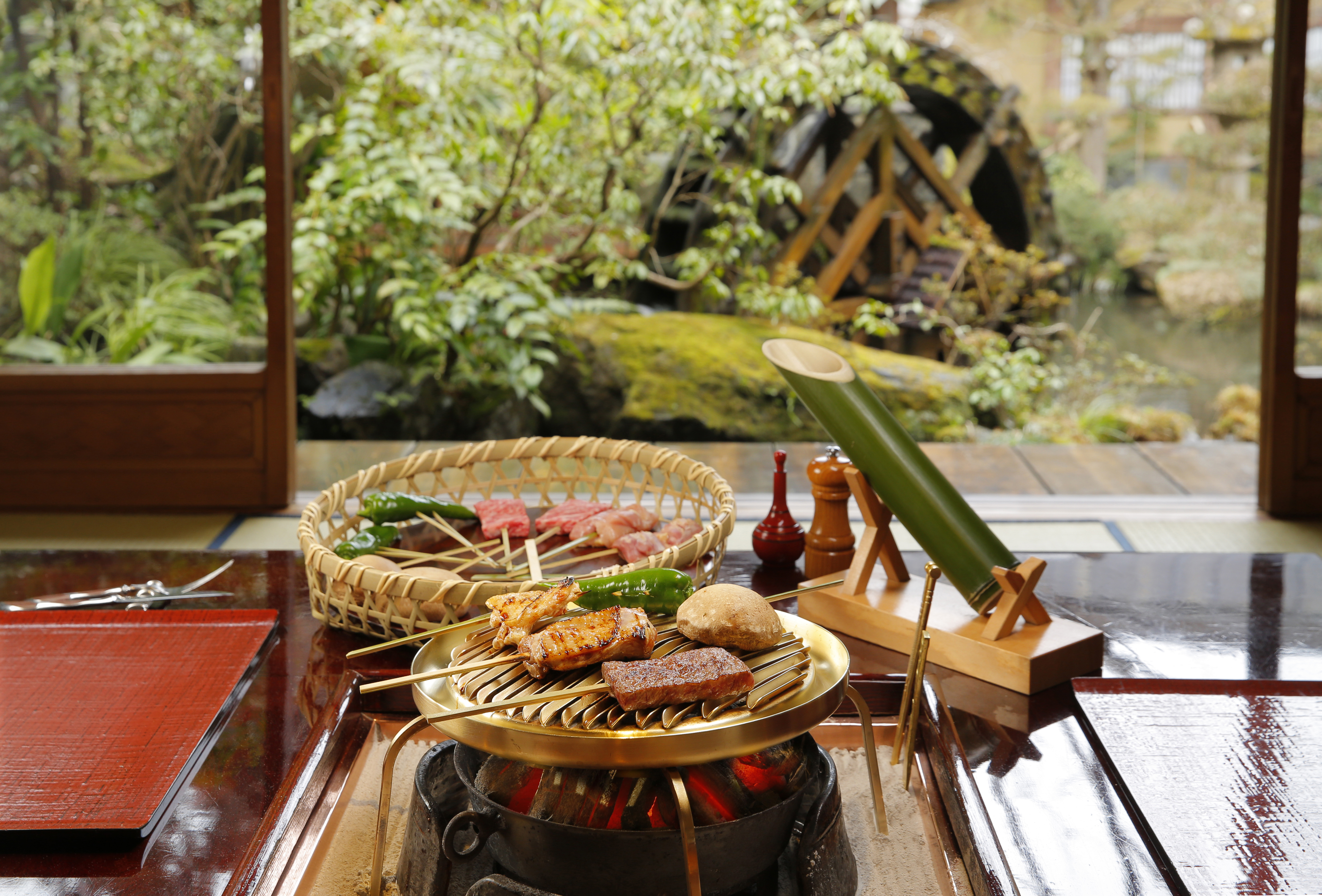 弾力に富み味わい深い鶏や特選和牛、季節の野菜など、素材の味をあますところなく引き出した炭火焼は、一度は味わってみたい名物料理です。庭内で料理人が炭火で焼き上げる川魚や、飾らない素朴な味わいの麦とろごはんも、心とお腹を満たしてくれるでしょう。季節ごとのメニューも豊富で、春のメニューには、タケノコや山菜などの里山の恵みが登場し、個室から眺めることができる春の自然とともに、香りと舌でも季節を満喫することができます。