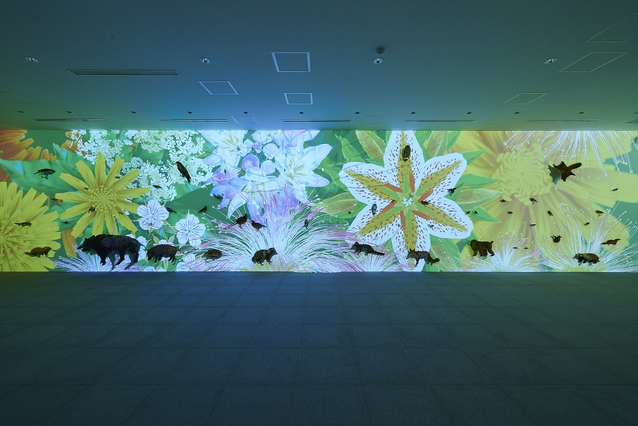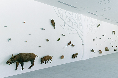 映像スペースでは、動物の剥製を配置した壁面を利用したプロジェクションマッピングが見どころ。ビジュアルデザインスタジオWOWが手掛ける、高尾の四季を映し出す約7分間のアニメーションは、色鮮やかな自然のみならず、生き生きとした動物たちの姿や、大雨のときの山の様子など、高尾山の多彩な表情をダイナミックに表現しています。