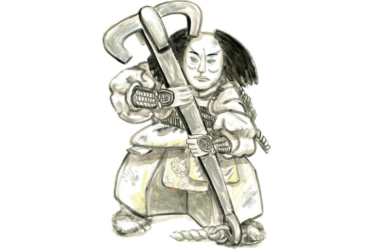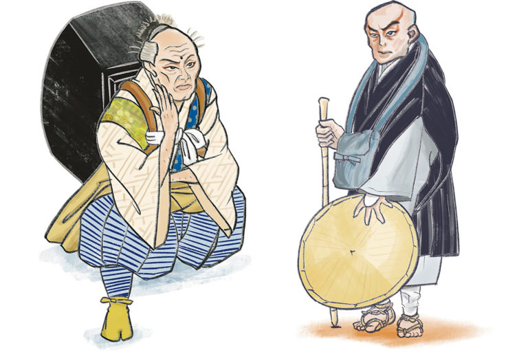 この関所・安宅の関(あたかのせき)に、源義経は、兄・頼朝との不和にさいなまれた末、京を逃れて東北へと落ちていく道中、さしかかりました。待ち受ける関守は、富樫左衛門といって、頼朝の命令を受けた切れ者です。義経と家来たちを、通行させてなるものか、とにらみを利かせています。