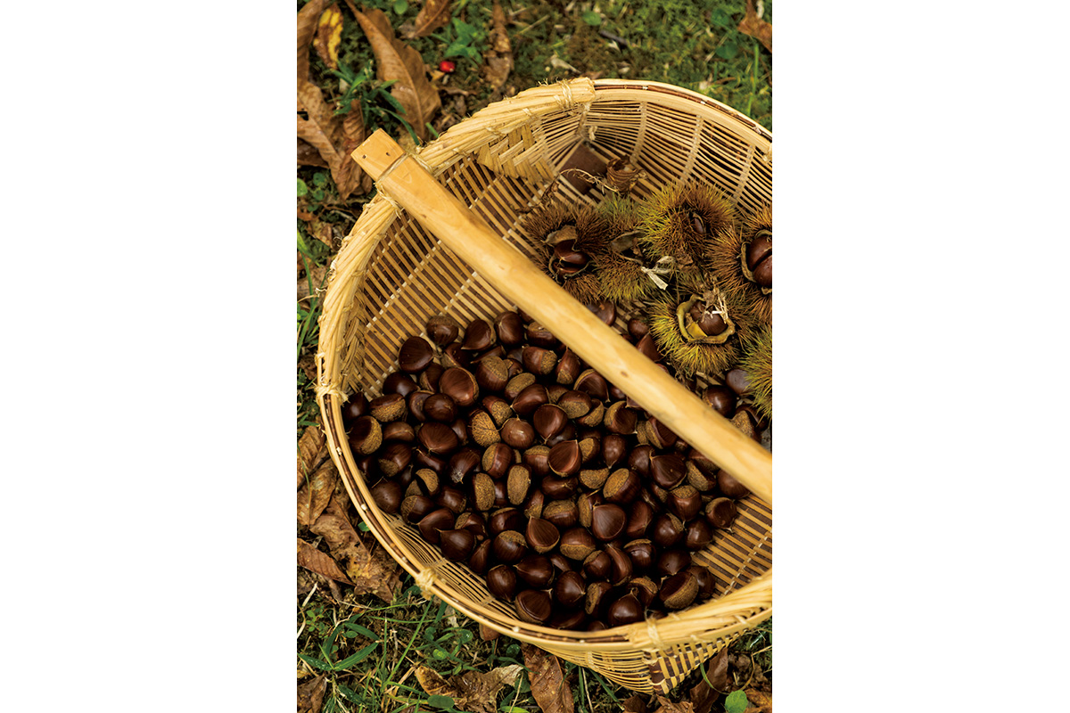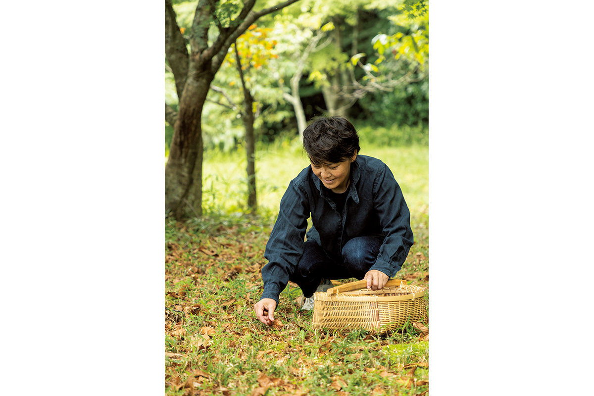福森道歩さんの後を追って畑と登り窯を通り抜け段差を上がった。そこには栗の木があり、食べ頃の実がたくさん落ちていた。近隣では松茸も採れ、その採取権ももっている。
