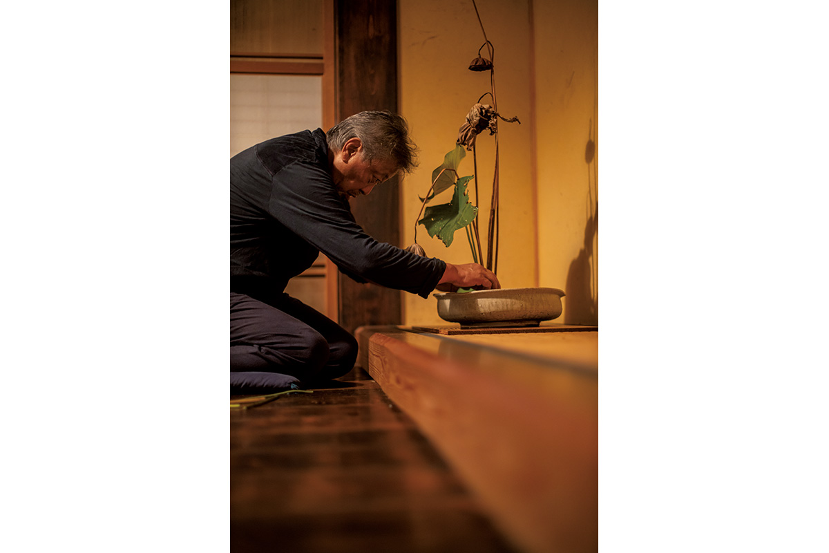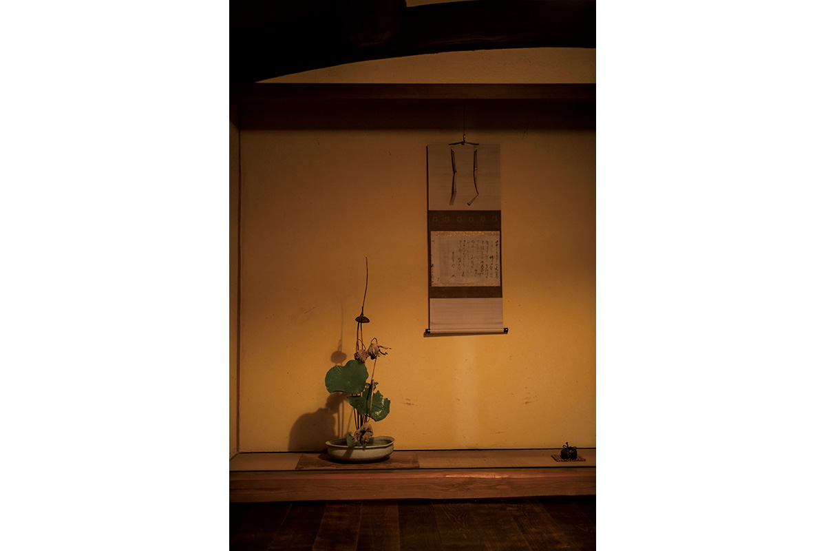 庭の蓮の葉と実を生け、江戸初期の臨済宗の僧・江月宗玩(こうげつ・そうがん)の軸を掛けた