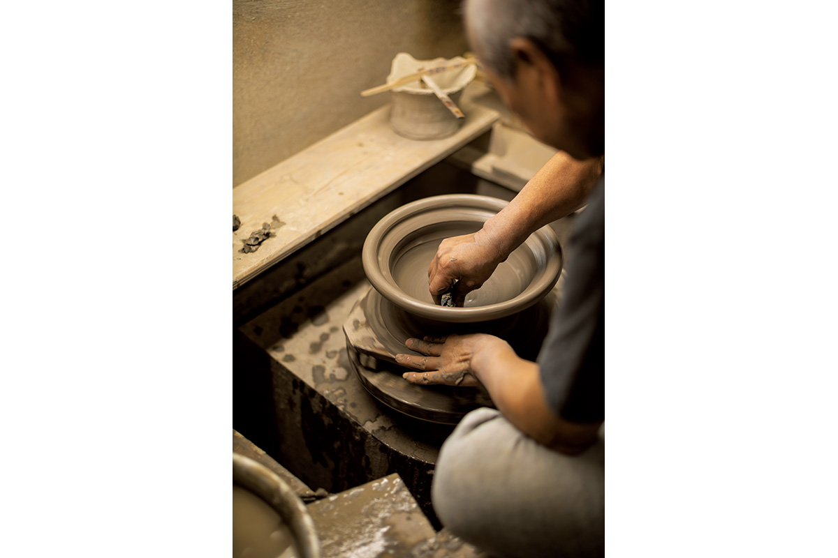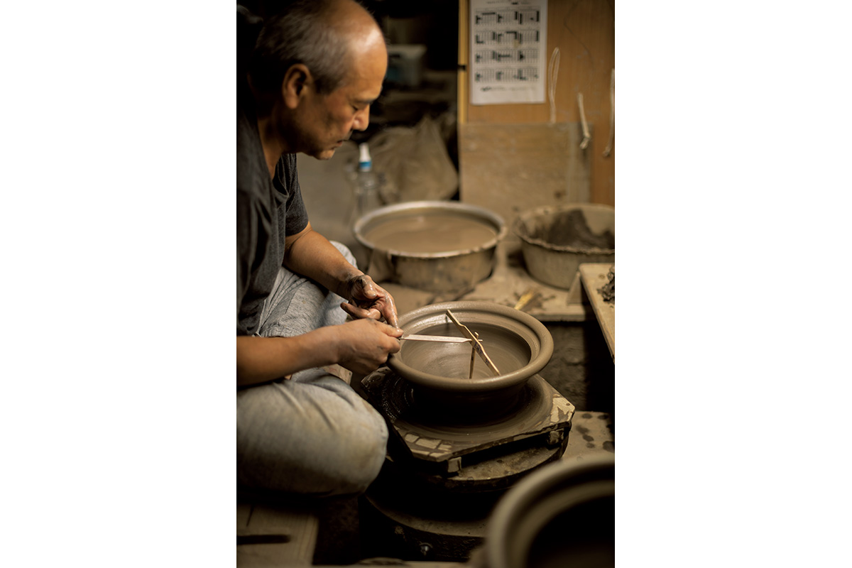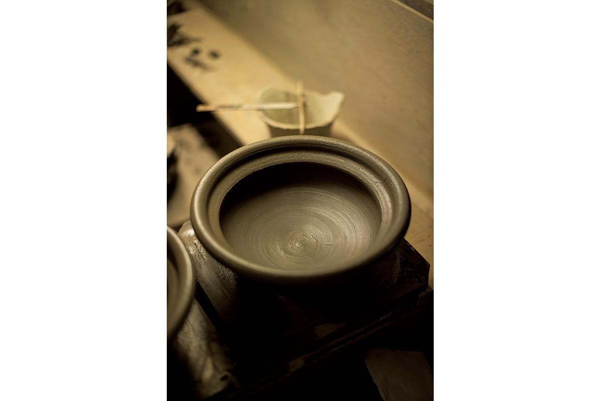 もちろん使うのは伊賀の陶土。太古の昔、琵琶湖の底にあったものが地殻変動で地上に出た土で、有機物を多く含んでいる。焼き上げると、この有機物が燃えて小さな空洞ができる。内部に空洞がある焼き上がりが、伊賀の土鍋の基本だ。熱しにくいが冷めにくいという特性が生まれるのである。土楽窯の黒鍋は熟練の職人が、ろくろで一つずつ挽き上げる。均一の厚みをもたせて大きな土鍋を挽くことのできる職人は伊賀でも数少ない。