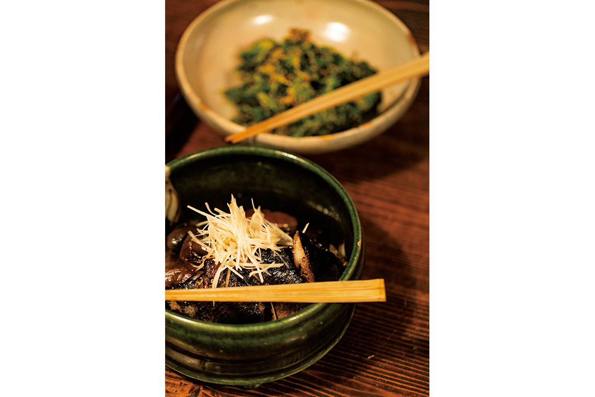 福森家の畑で採れた野菜。ホウレンソウとニンジン菜のゴマ和え。抜き菜といって、生育途中で抜いた若芽も食卓に並ぶ