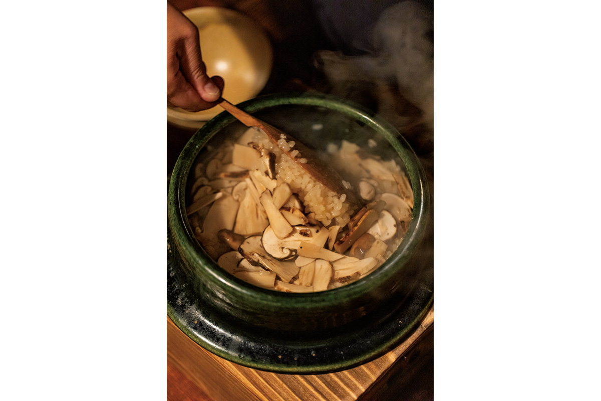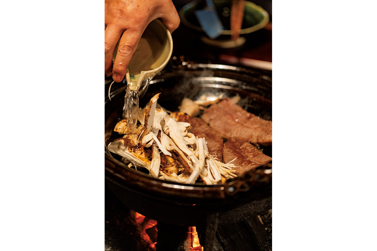 伊賀牛のミスジに松茸を入れ、日本酒を加えた。圡楽窯の黒鍋は深くないので、陶板焼きができる。煮る、炊くはもちろん炒めるも可能な、万能の土鍋だ