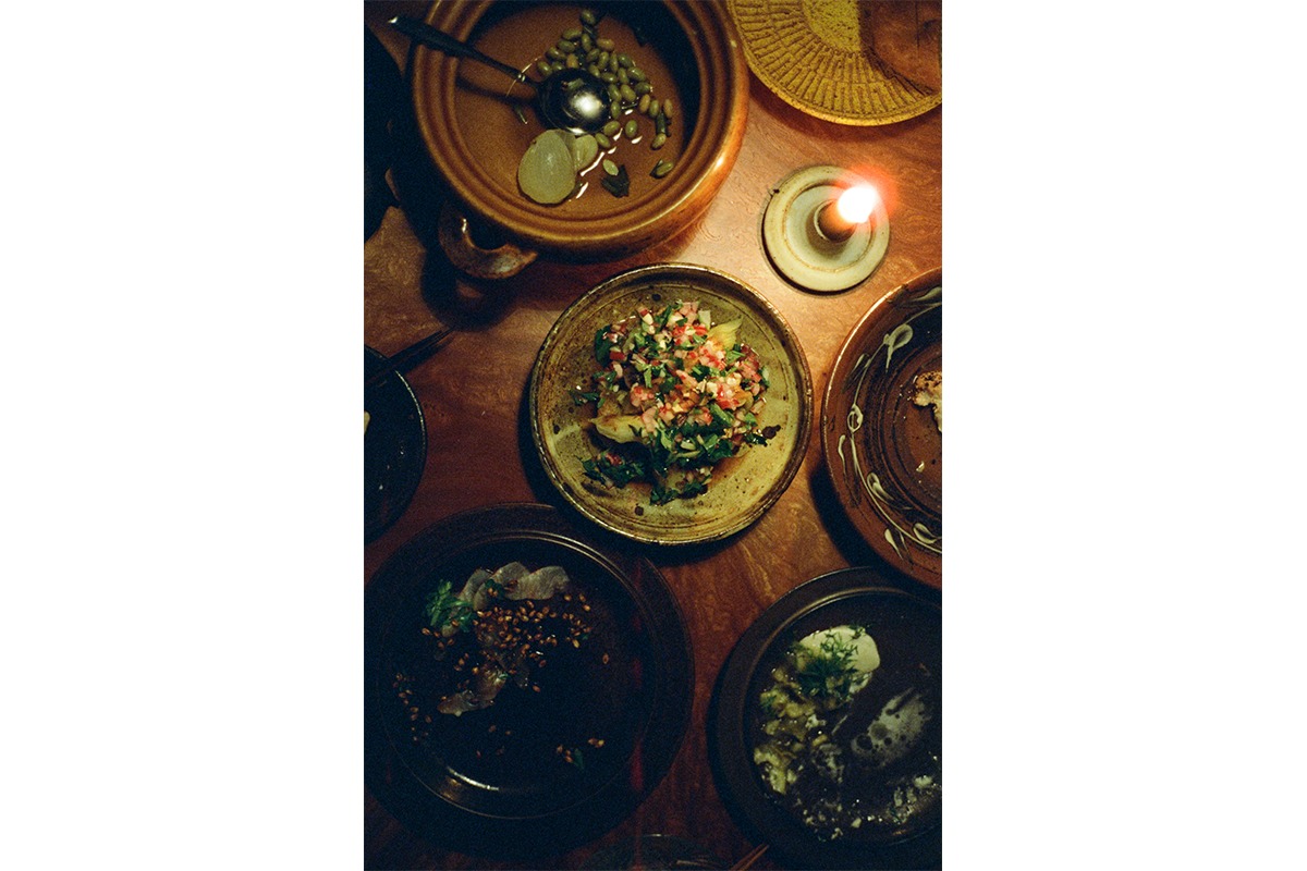 地元農家や漁師らから直接仕入れた旬の食材を使い、その可能性を最大限引き出すべく季節毎にメニューも再構築していていく一方、瀬戸内産のフレッシュチーズと焦がし塩レモン、ローズマリーとレモンの長時間発酵フォカッチャ、醤油粕のカルパッチョなど、一年を通して提供する定番メニューも提供する。